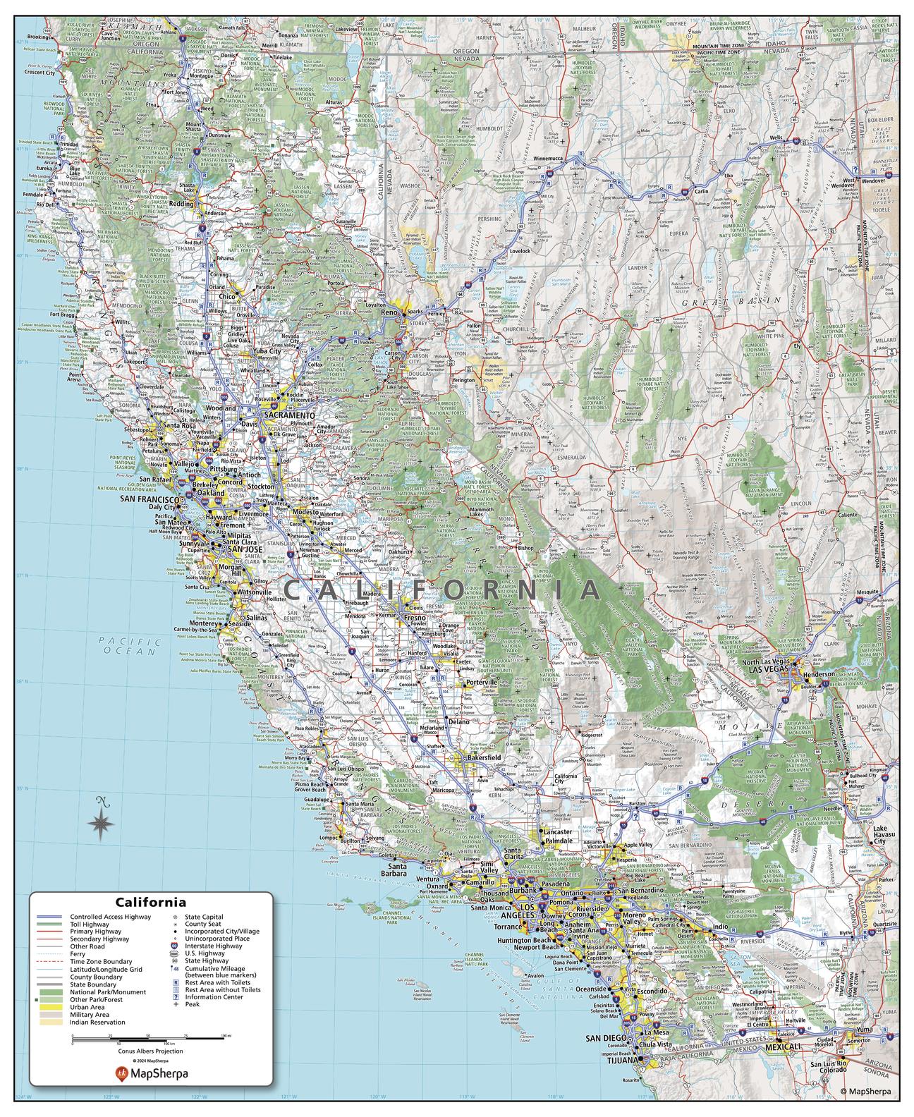 This detailed wall map of California is perfect for both educational and business purposes. The easy-to-read map features vibrant colors and clear labeling of cities, counties, highways, and geographical features. All national and state highways that connect the state are all clearly labelled on the map, while the legend notes the different road and land use classifications such as urban, park, military, and many more. The boundaries of each county in the state are defined and named clearly. Whether you are a student, teacher, business person or geography enthusiast, this map is a valuable addition to any space.
