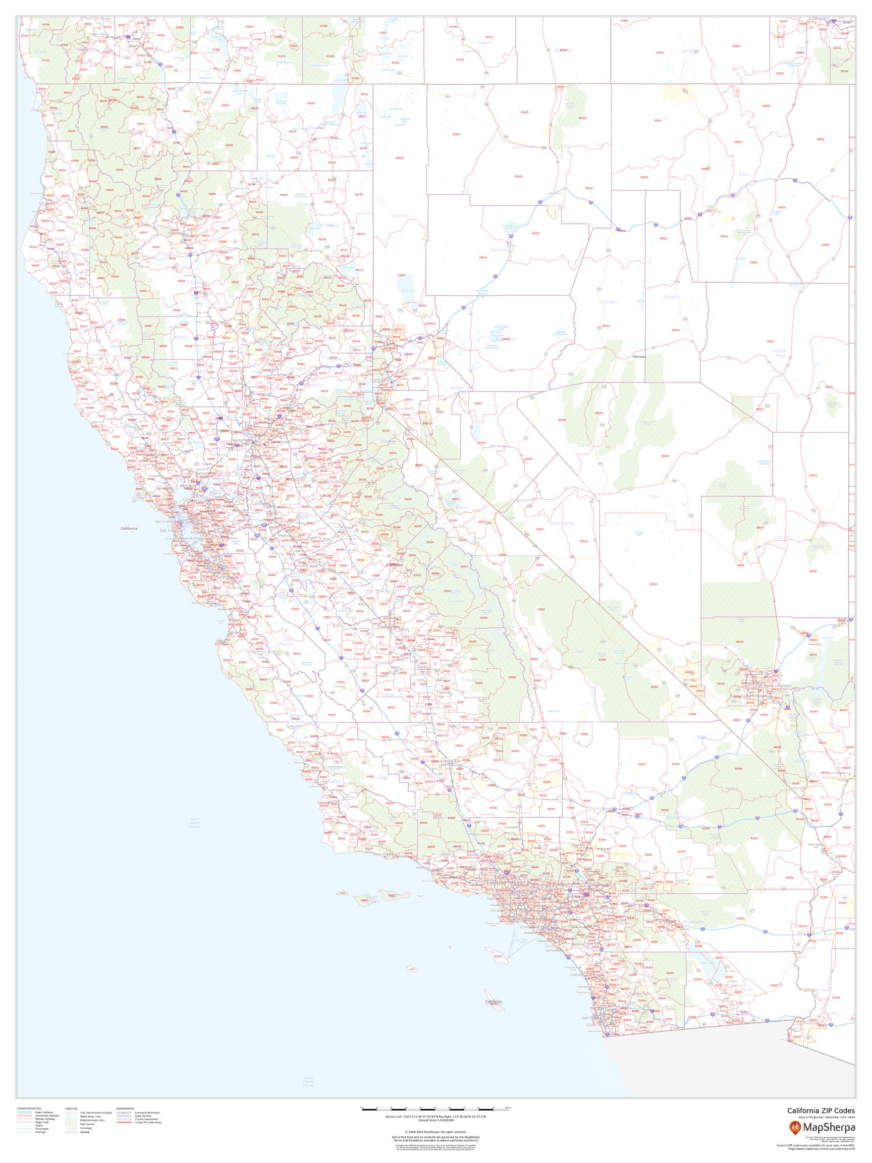 This map of California shows ZIP codes overlaid on a road map. Base map features include county boundaries, major road network features, and state and national parks and conservation areas.