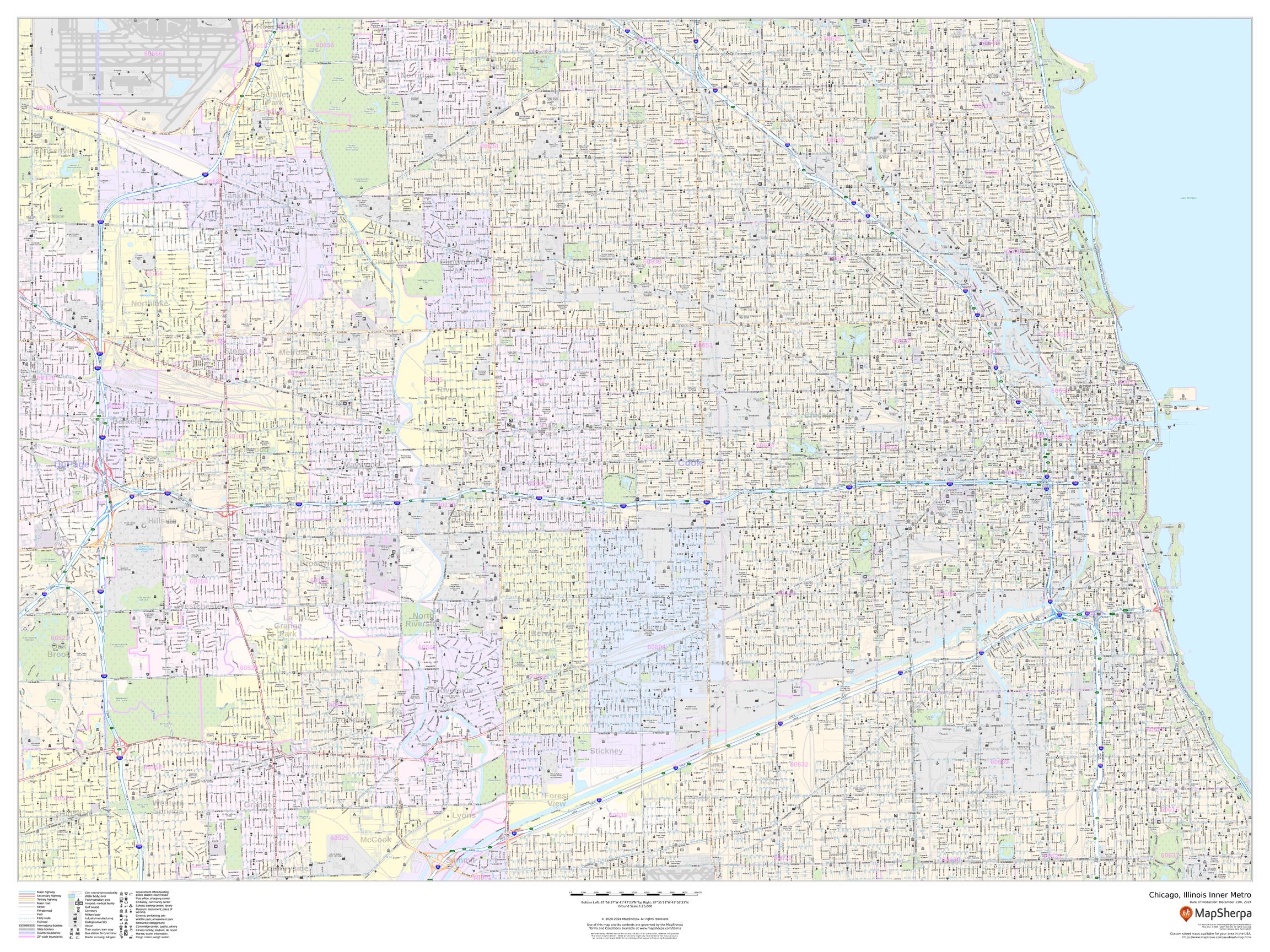 This landscape-oriented map of central Chicago, Illinois shows detailed street level information including extensive street labeling. Ideal for planning of deliveries, home services, sales territories, real estate and much more. Base map features include all roads with major roads and highways labelled; neighborhood names; railways; high level land use such as parks and recreation areas, industrial areas and hospital campuses; and a variety of points of interest including schools, libraries, stadiums, museums, border crossings and more.