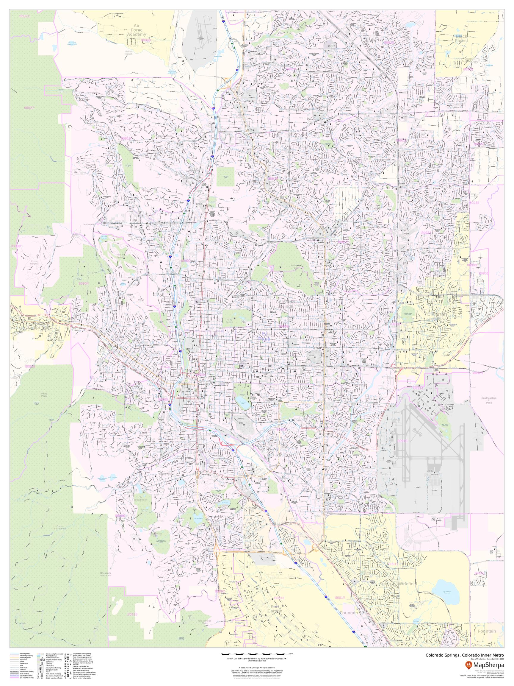 This portrait-oriented map of central Colorado Springs, Colorado shows detailed street level information including extensive street labeling. Ideal for planning of deliveries, home services, sales territories, real estate and much more. Base map features include all roads with major roads and highways labelled; neighborhood names; railways; high level land use such as parks and recreation areas, industrial areas and hospital campuses; and a variety of points of interest including schools, libraries, stadiums, museums, border crossings and more.
