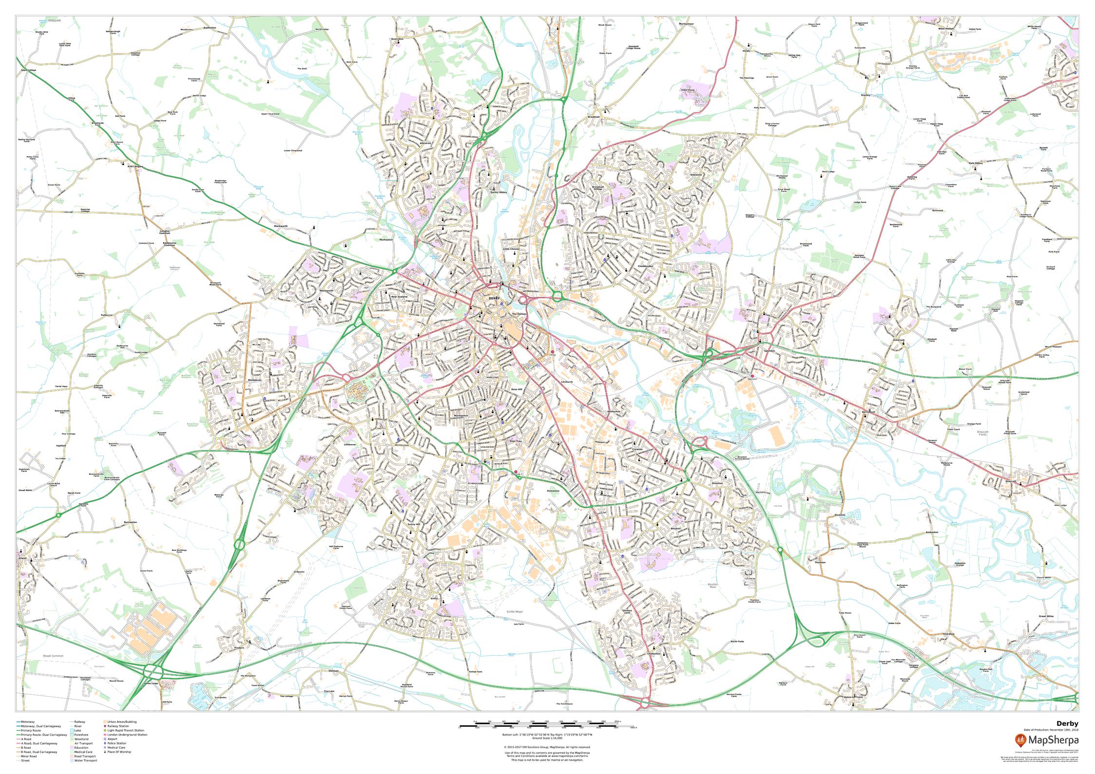 This map of Derby shows detailed street level information including extensive street labelling. Ideal for planning of deliveries, home services, sales territories, real estate and much more.