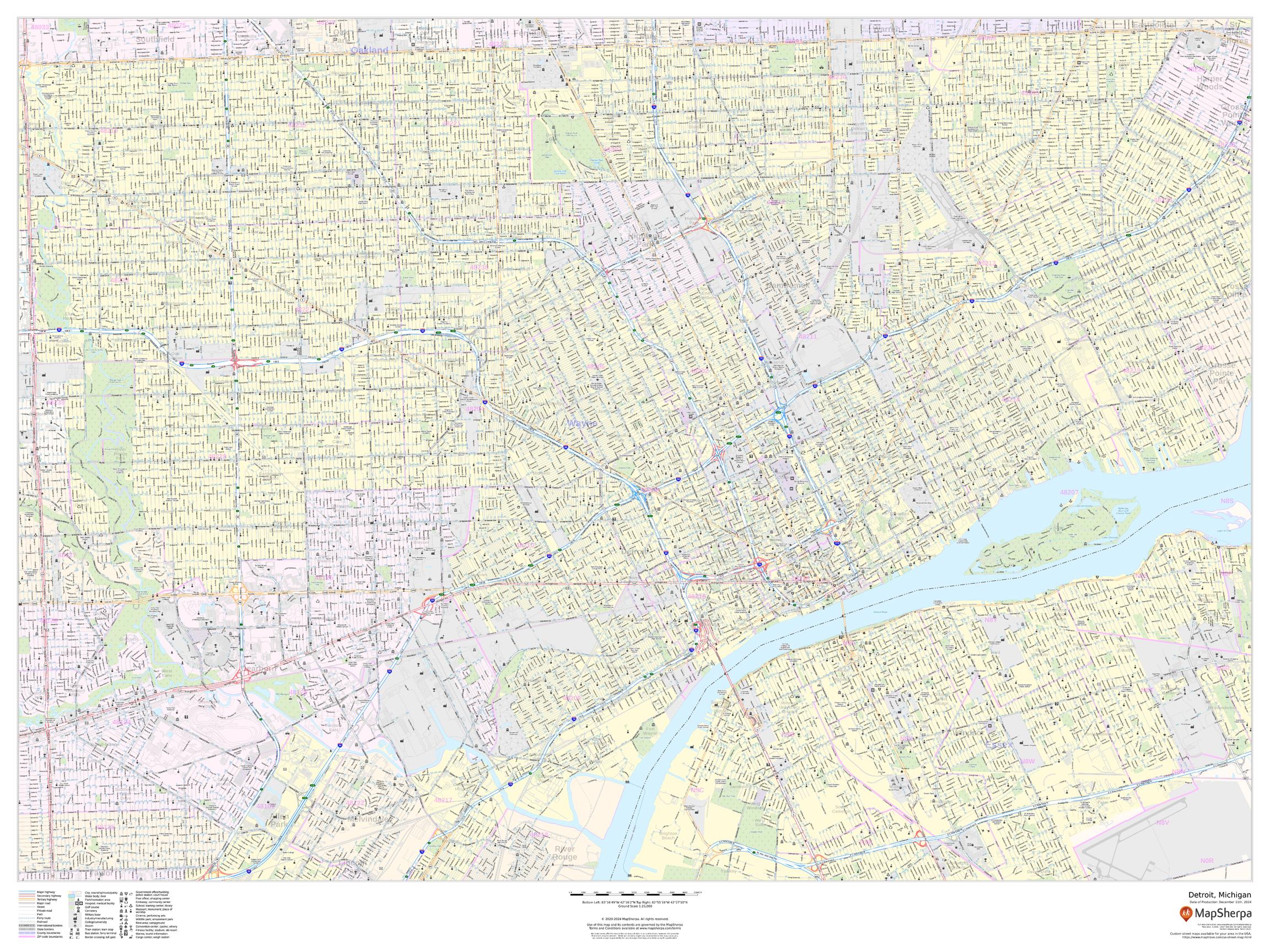 This landscape-oriented map of Detroit, Michigan shows detailed street level information including extensive street labeling. Ideal for planning of deliveries, home services, sales territories, real estate and much more. Base map features include all roads with major roads and highways labelled; neighborhood names; railways; high level land use such as parks and recreation areas, industrial areas and hospital campuses; and a variety of points of interest including schools, libraries, stadiums, museums, border crossings and more.