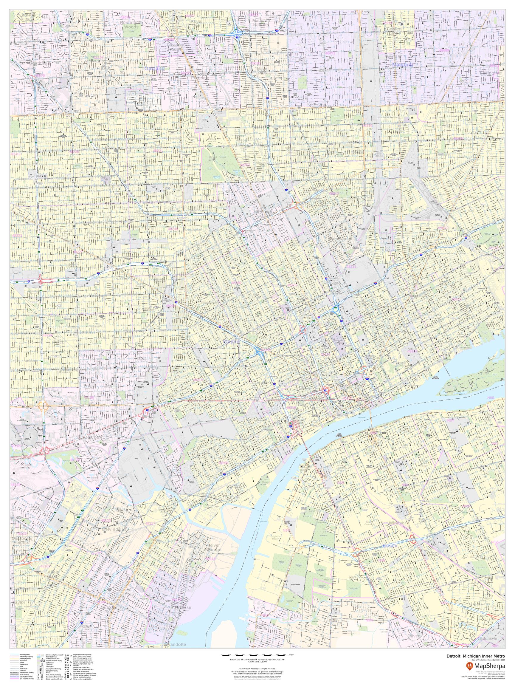 This portrait-oriented map of central Detroit, Michigan shows detailed street level information including extensive street labeling. Ideal for planning of deliveries, home services, sales territories, real estate and much more. Base map features include all roads with major roads and highways labelled; neighborhood names; railways; high level land use such as parks and recreation areas, industrial areas and hospital campuses; and a variety of points of interest including schools, libraries, stadiums, museums, border crossings and more.