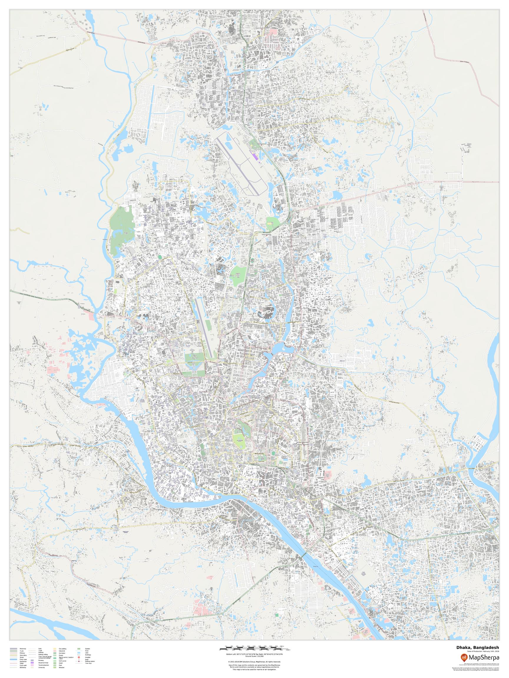 This detailed street map of Dhaka, Bangladesh shows the full road and rail networks, points of interest, and land use across the city. Useful for businesses operating in the city, or as consumer memorabilia of the city.