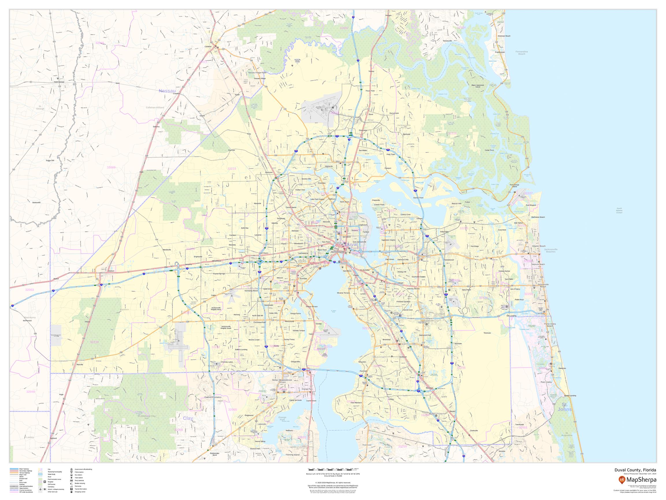 This map of Duval County, Florida shows regional level information. Base map features include highways and major roads with labelling; neighborhood names; railways; high level land use such as parks and recreation areas, industrial areas and hospital campuses; and a selection of points of interest including transportation hubs like airports and train stations, tourist information, police stations and shopping centres. ZIP code boundaries are shown as a secondary map feature.