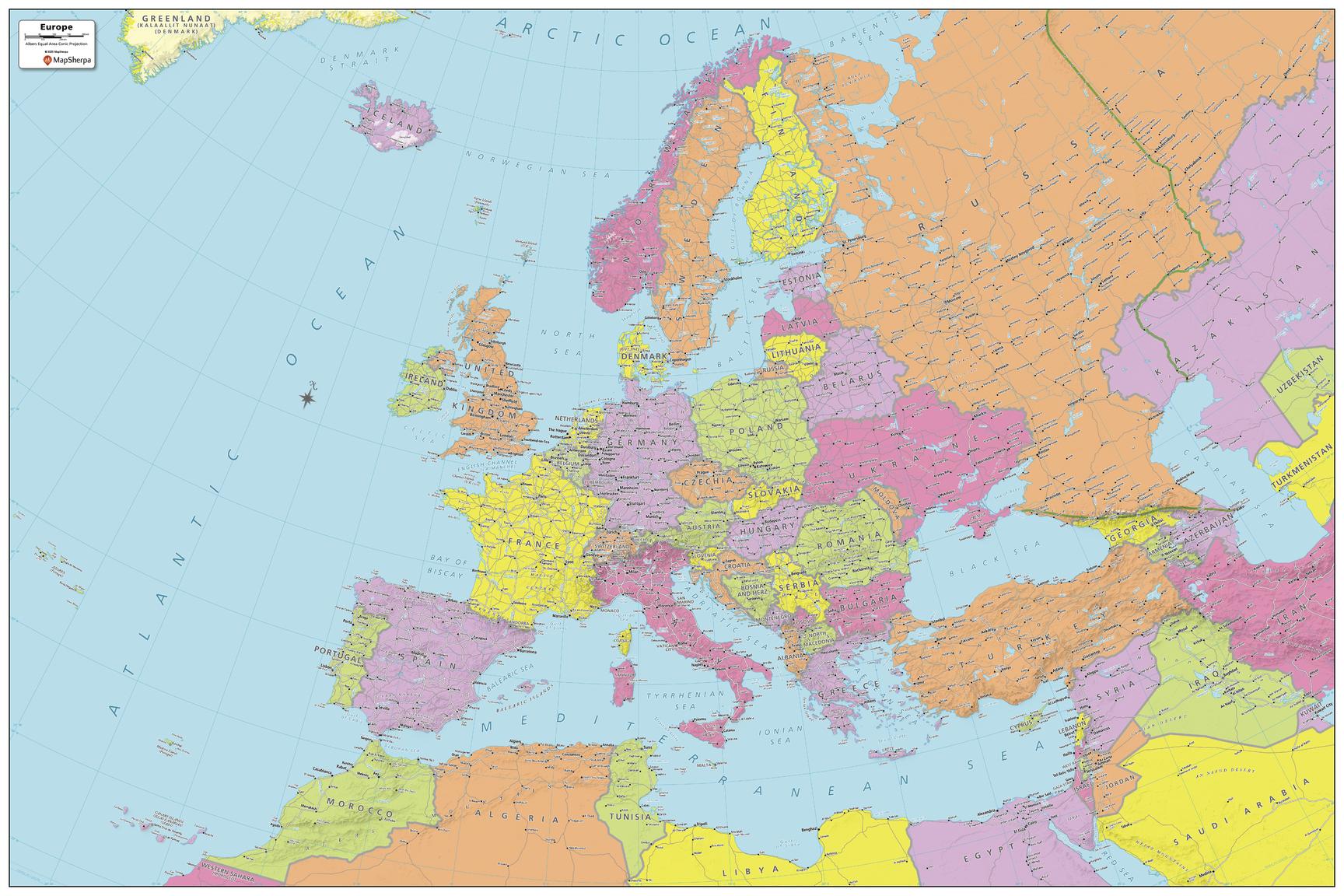 Explore the continent of Europe with this map created specifically for MapSherpa. New and up-to-date, this Map shows all the countries that make up the continent. Stretching from the Atlantic Ocean in the west to Arctic Circle and beyond, to the Ural Mountains and the Mediterranean Sea, this map prominently shows; national capitals, primary cities & towns, primary water features, mountain ranges and all time zones. With this map you can clearly see that some countries straddle both Europe and Asia! With multiple sizes available, this is the perfect reference map for home, office, or school use.