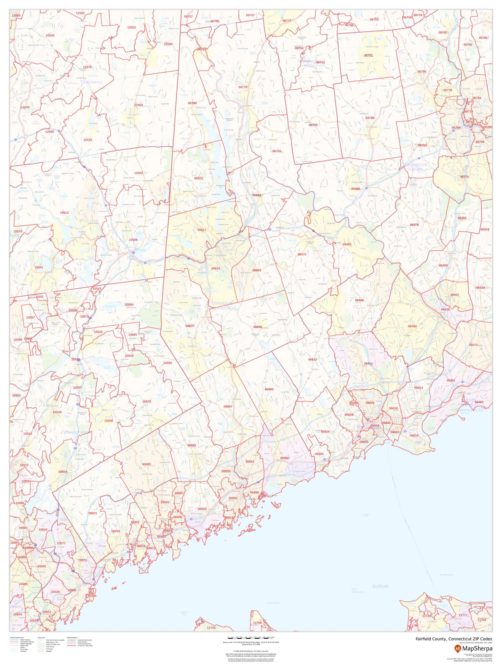 This map of Fairfield County, Connecticut shows ZIP code areas overlaid on a road map. Ideal for planning of deliveries, home ervices, sales territories, real estate and much more. Base map features include all roads with major roads and highways labelled; neighborhood names; railways; and high level land use such as parks and recreation areas, industrial areas and hospital campuses.