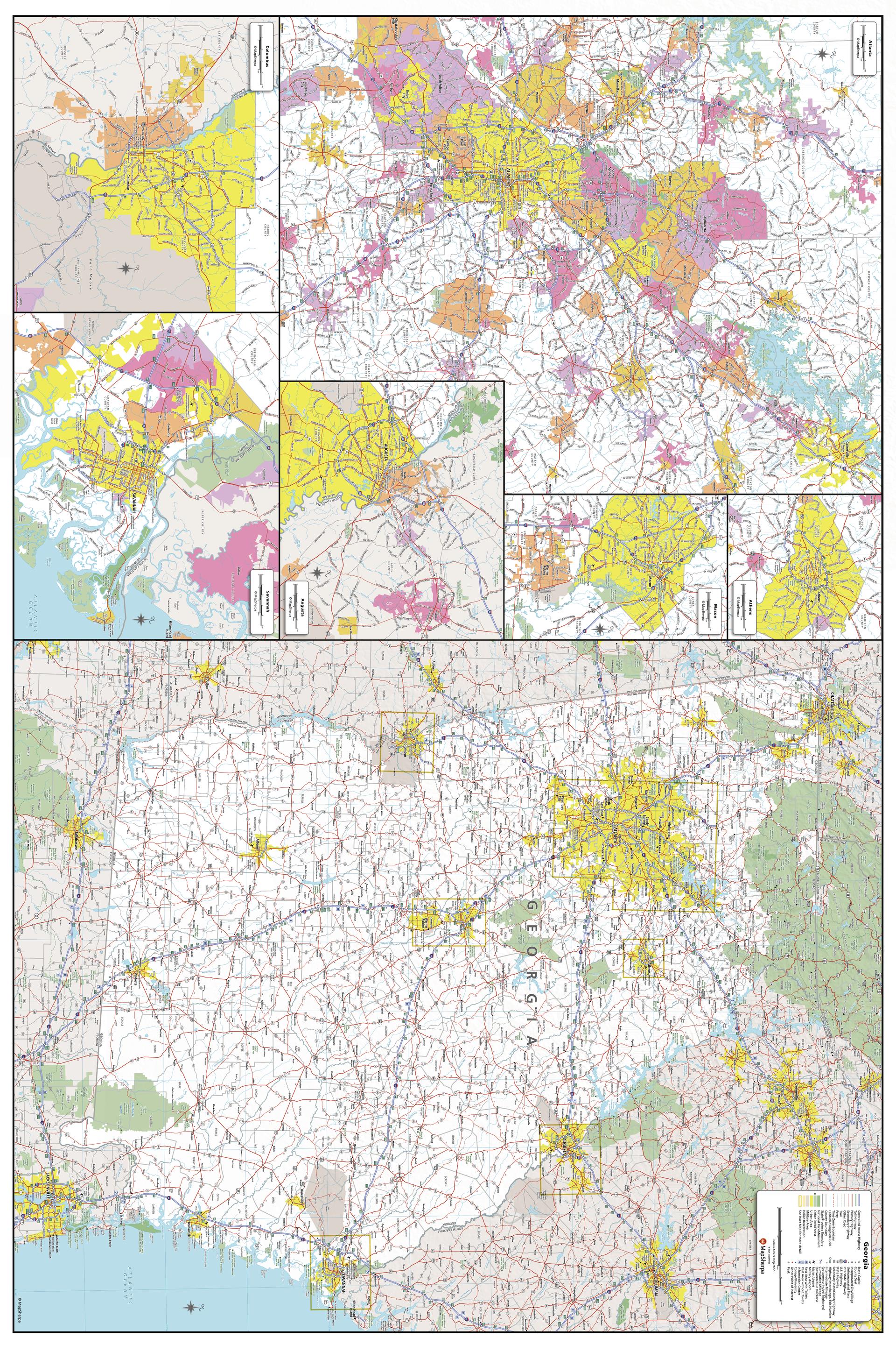 This detailed wall map of Georgia is perfect for both educational and business purposes. The easy-to-read map features vibrant colors and clear labeling of cities, counties, highways, and geographical features. All national and state highways that connect the state are all clearly labelled on the map, while the legend notes the different road and land use classifications such as urban, park, military, and many more. The boundaries of each county in the state are defined and named clearly. Whether you are a student, teacher, business person or geography enthusiast, this map is a valuable addition to any space.