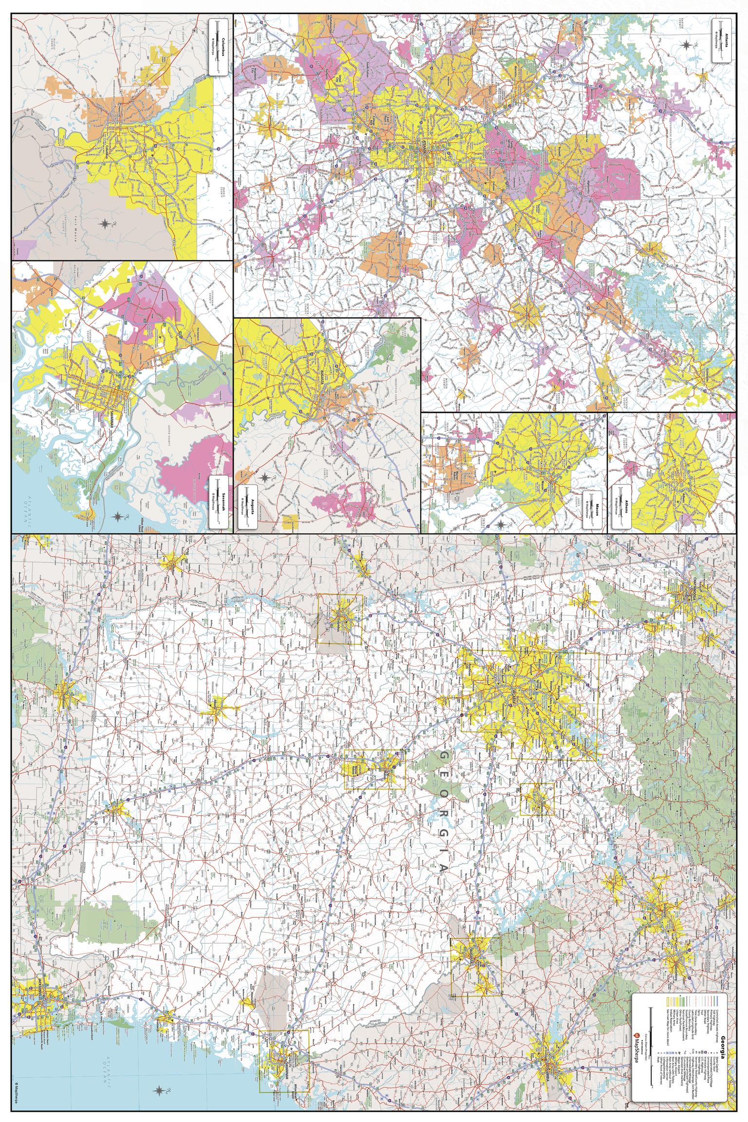 This detailed wall map of Georgia is perfect for both educational and business purposes. The easy-to-read map features vibrant colors and clear labeling of cities, counties, highways, and geographical features. All national and state highways that connect the state are all clearly labelled on the map, while the legend notes the different road and land use classifications such as urban, park, military, and many more. The boundaries of each county in the state are defined and named clearly. Whether you are a student, teacher, business person or geography enthusiast, this map is a valuable addition to any space.