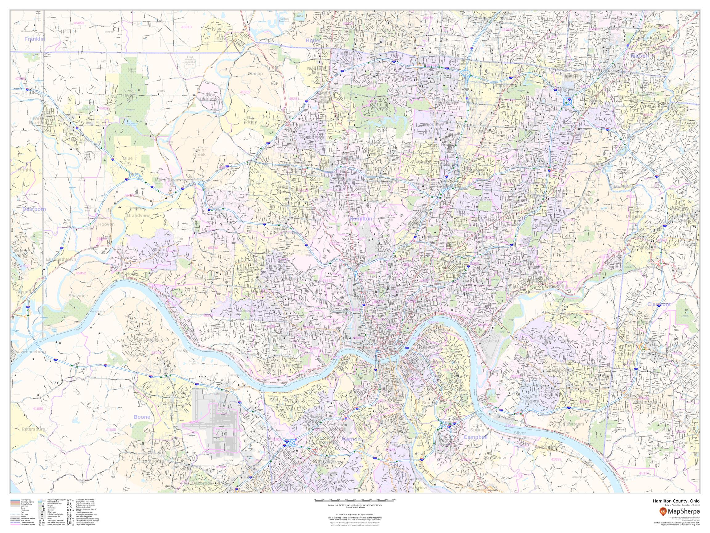 This map of Hamilton County, Ohio shows street level information including street labeling. Base map features include all roads with major roads and highways labelled; neighborhood names; railways; high level land use such as parks and recreation areas, industrial areas and hospital campuses; and a variety of points of interest including libraries, stadiums, museums, border crossings and more. ZIP code boundaries are shown as a secondary map feature.