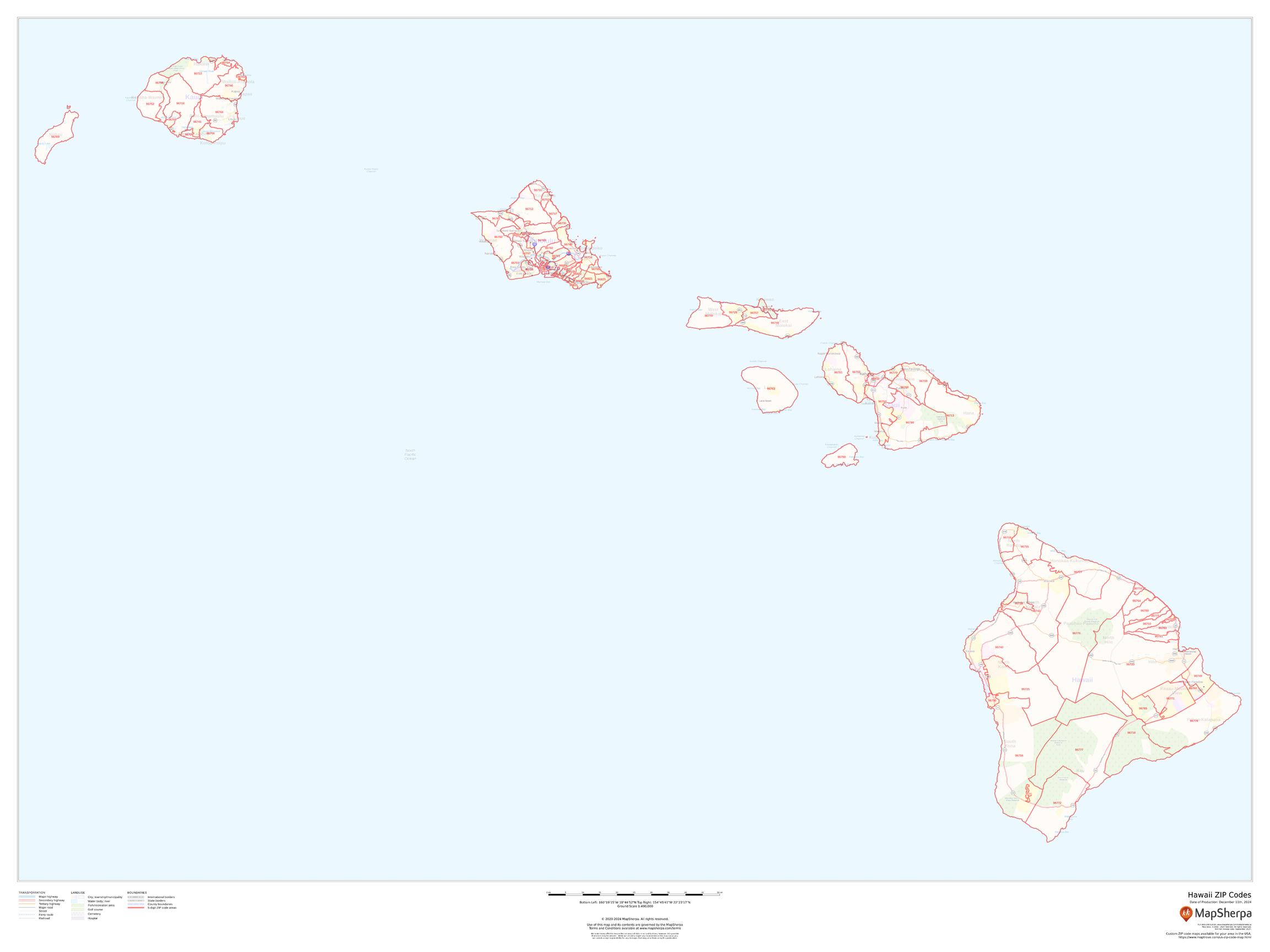 This map of Hawaii shows ZIP codes overlaid on a road map. Base map features include municipality and county boundaries, major road network features, and state and national parks and conservation areas.