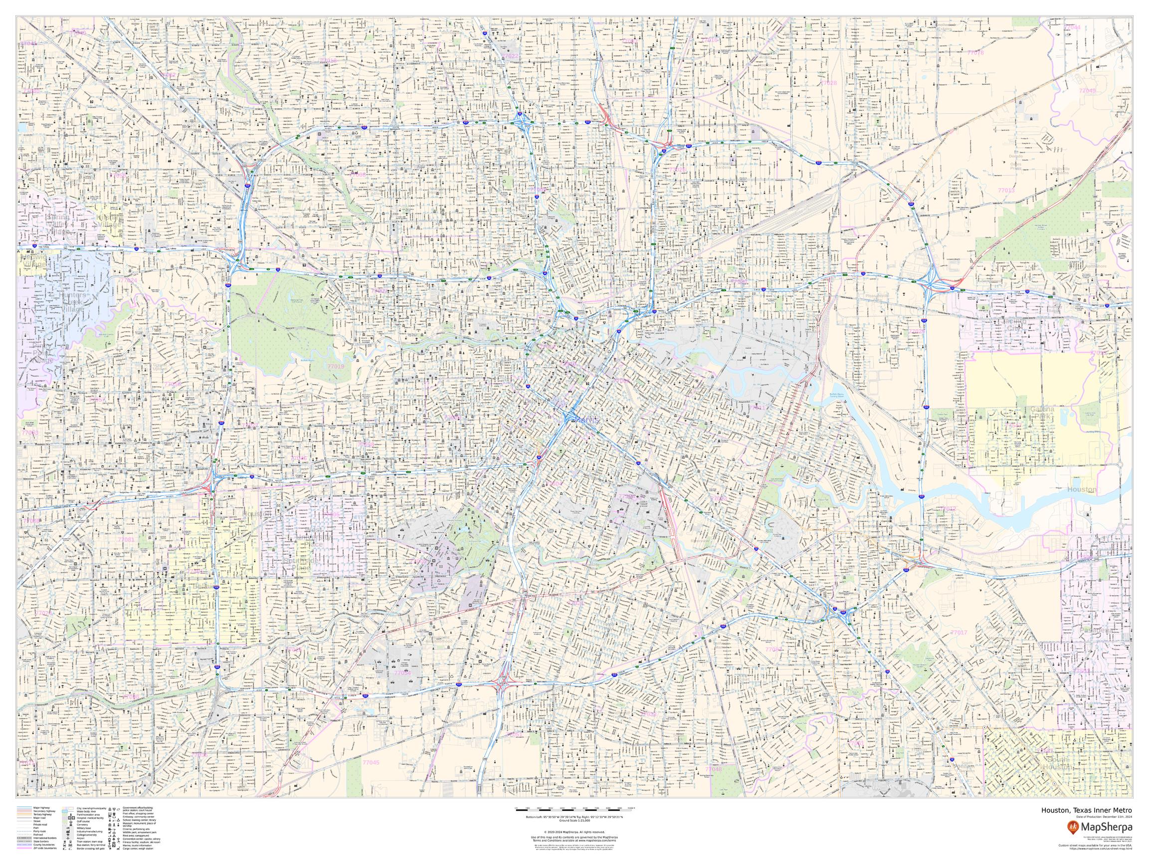 This landscape-oriented map of central Houston, Texas shows detailed street level information including extensive street labeling. Ideal for planning of deliveries, home services, sales territories, real estate and much more. Base map features include all roads with major roads and highways labelled; neighborhood names; railways; high level land use such as parks and recreation areas, industrial areas and hospital campuses; and a variety of points of interest including schools, libraries, stadiums, museums, border crossings and more.