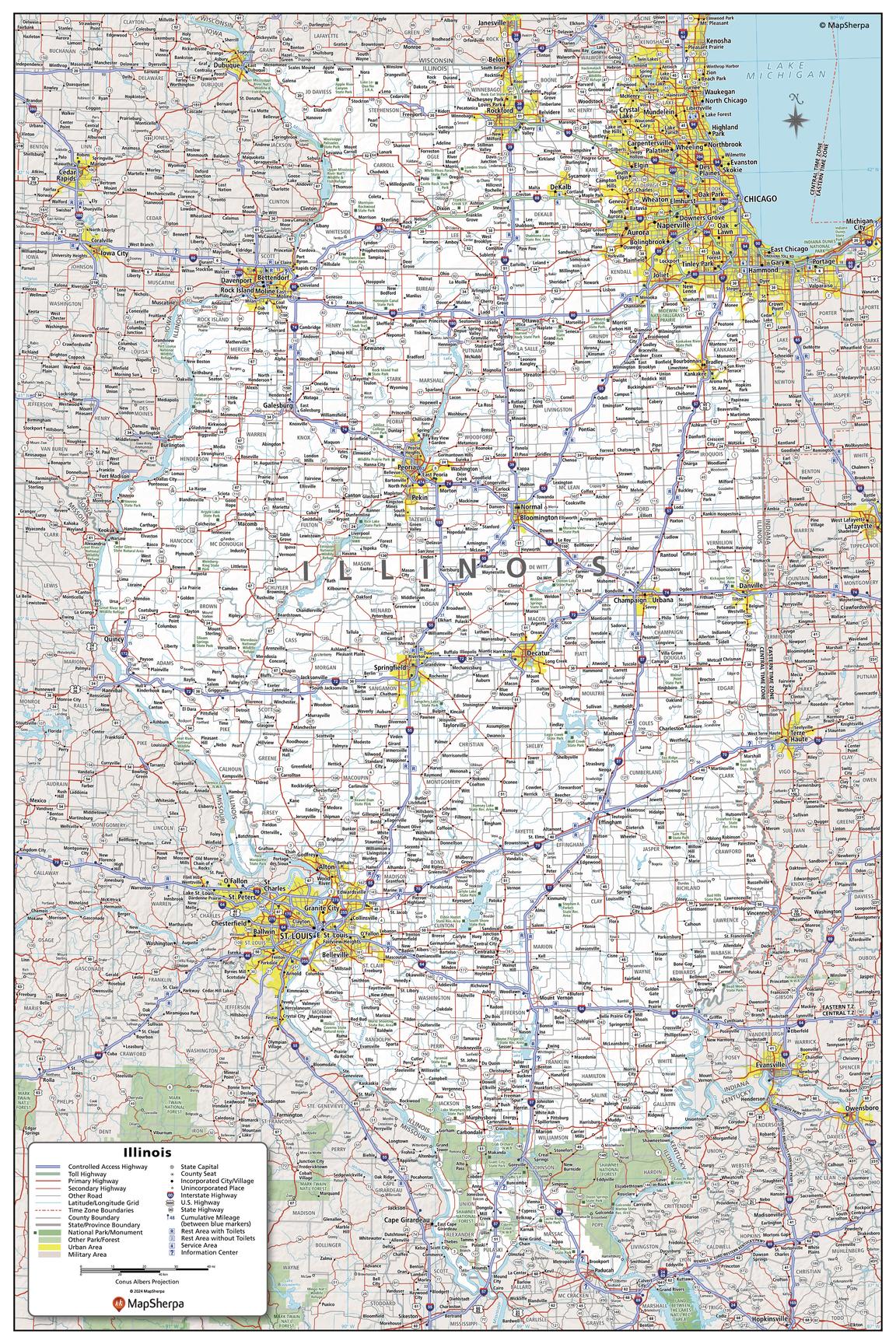 This detailed wall map of Illinois is perfect for both educational and business purposes. The easy-to-read map features vibrant colors and clear labeling of cities, counties, highways, and geographical features. All national and state highways that connect the state are all clearly labelled on the map, while the legend notes the different road and land use classifications such as urban, park, military, and many more. The boundaries of each county in the state are defined and named clearly. Whether you are a student, teacher, business person or geography enthusiast, this map is a valuable addition to any space.