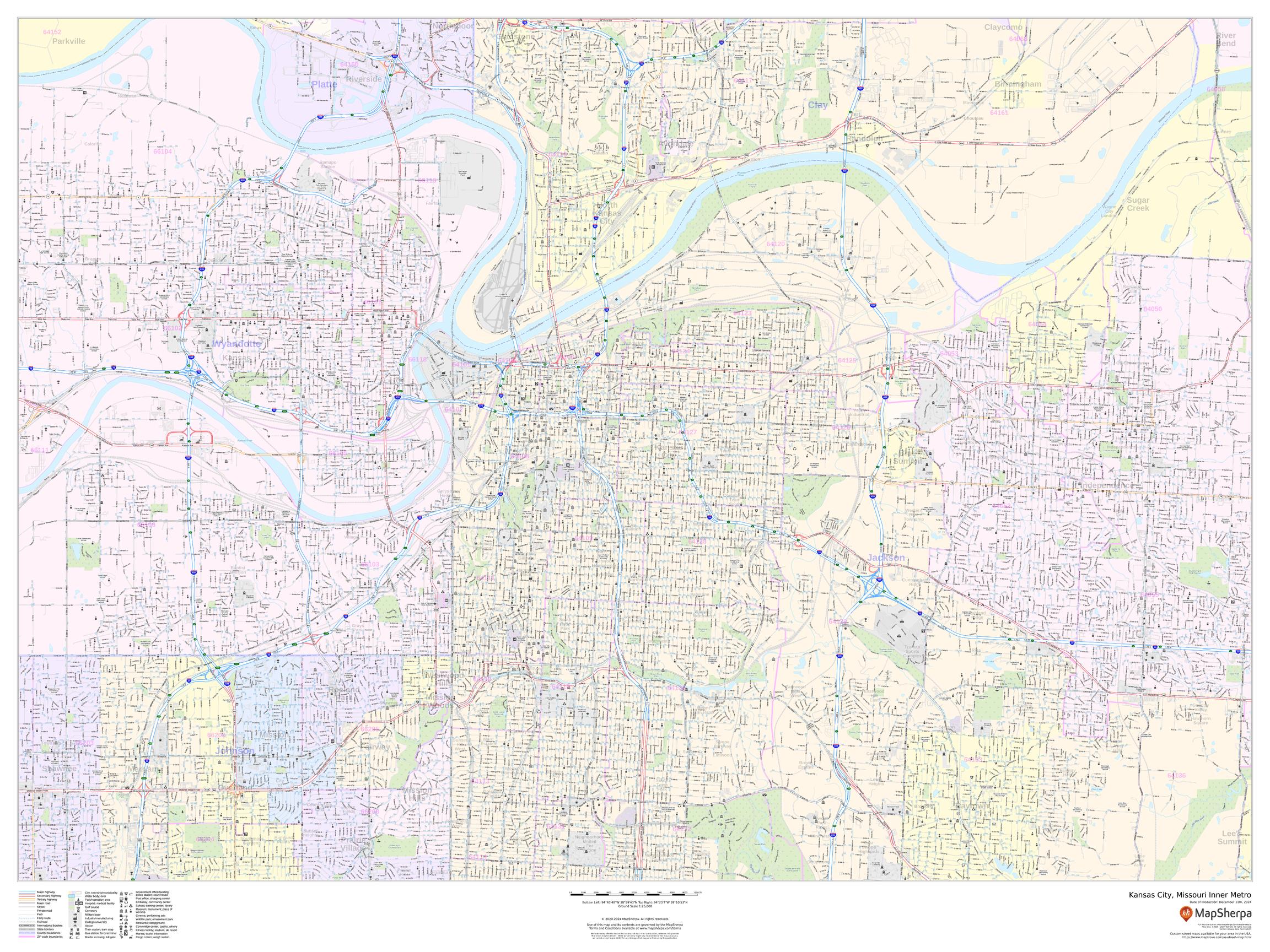 This landscape-oriented map of central Kansas City, Missouri shows detailed street level information including extensive street labeling. Ideal for planning of deliveries, home services, sales territories, real estate and much more. Base map features include all roads with major roads and highways labelled; neighborhood names; railways; high level land use such as parks and recreation areas, industrial areas and hospital campuses; and a variety of points of interest including schools, libraries, stadiums, museums, border crossings and more.