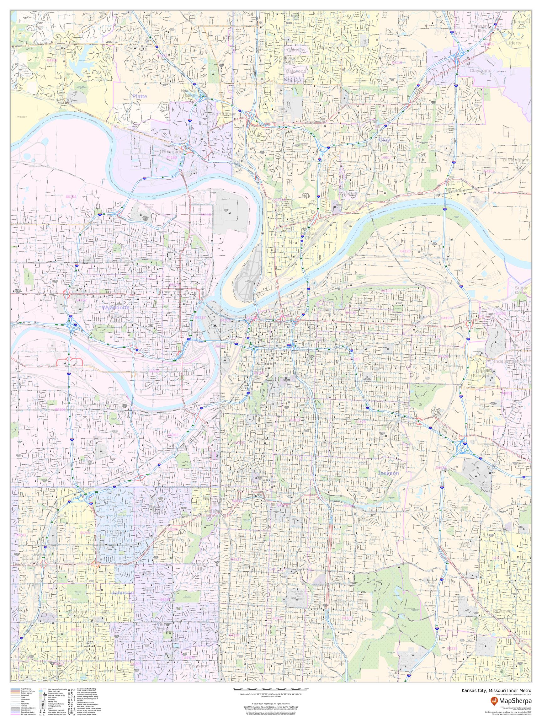 This portrait-oriented map of central Kansas City, Missouri shows detailed street level information including extensive street labeling. Ideal for planning of deliveries, home services, sales territories, real estate and much more. Base map features include all roads with major roads and highways labelled; neighborhood names; railways; high level land use such as parks and recreation areas, industrial areas and hospital campuses; and a variety of points of interest including schools, libraries, stadiums, museums, border crossings and more.