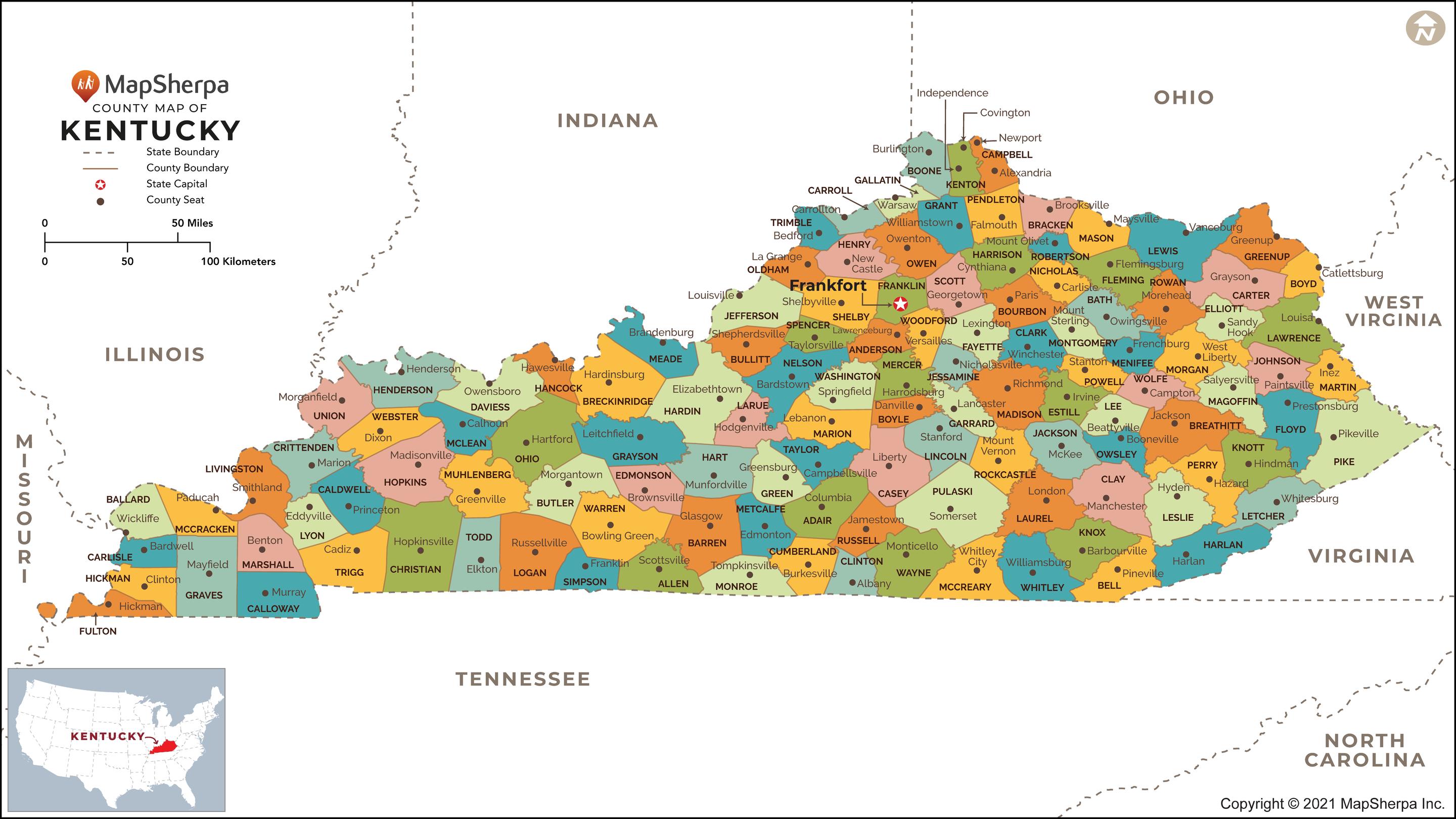 This map has been created exclusively for MapSherpa, and designed for reference or business use. Clear and clean colors & fonts matched with cartographic research makes this map of Kentucky Counties Map easily readable and useful. The map shows the 120 counties of Kentucky and their borders across the Bluegrass State.