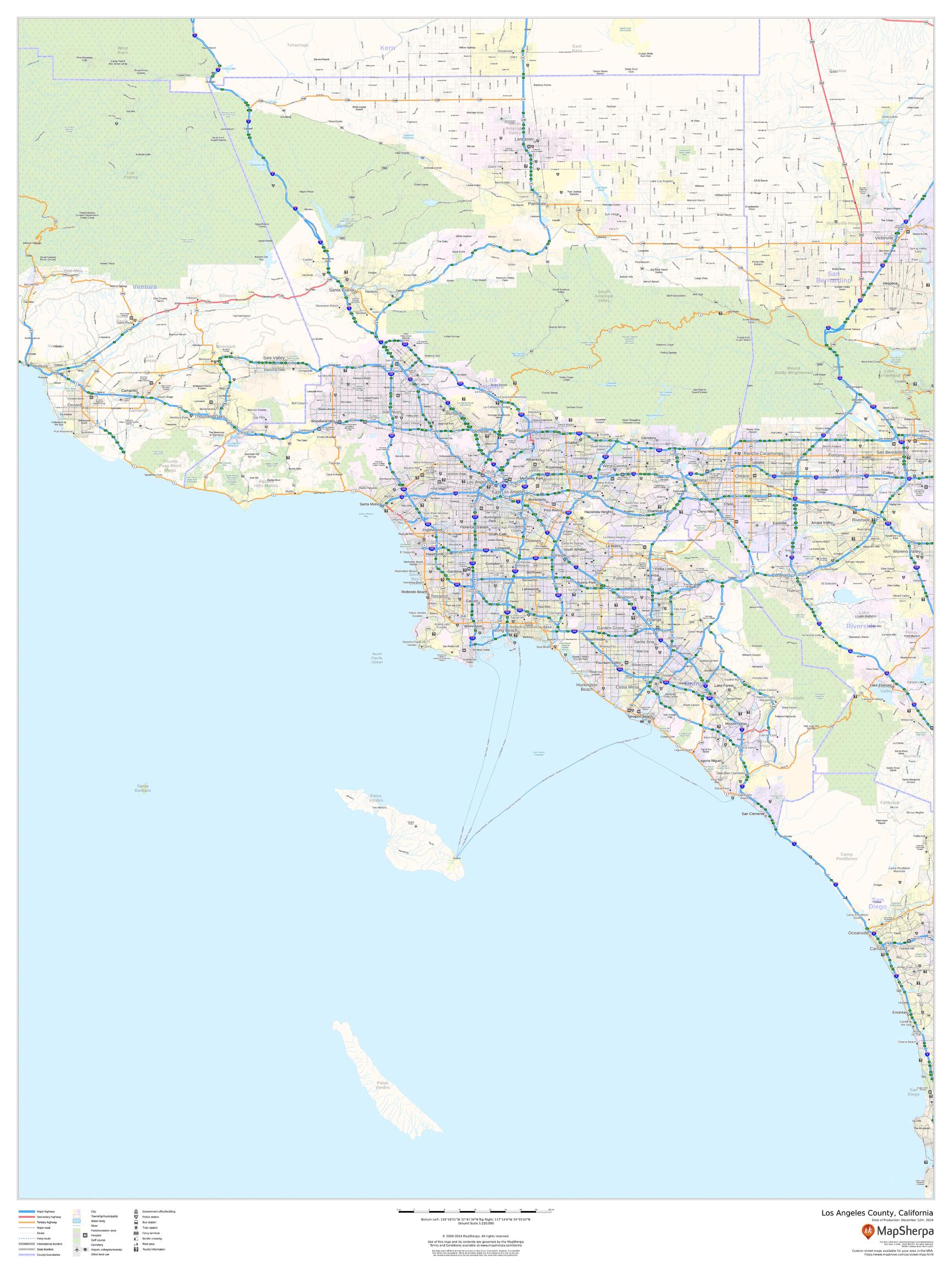 This map of Los Angeles County, California shows regional level information. Base map features include highways and major roads with labelling; high level land use such as parks and recreation areas; and a selection of points of interest including transportation hubs like airports and train stations, tourist information and police stations.