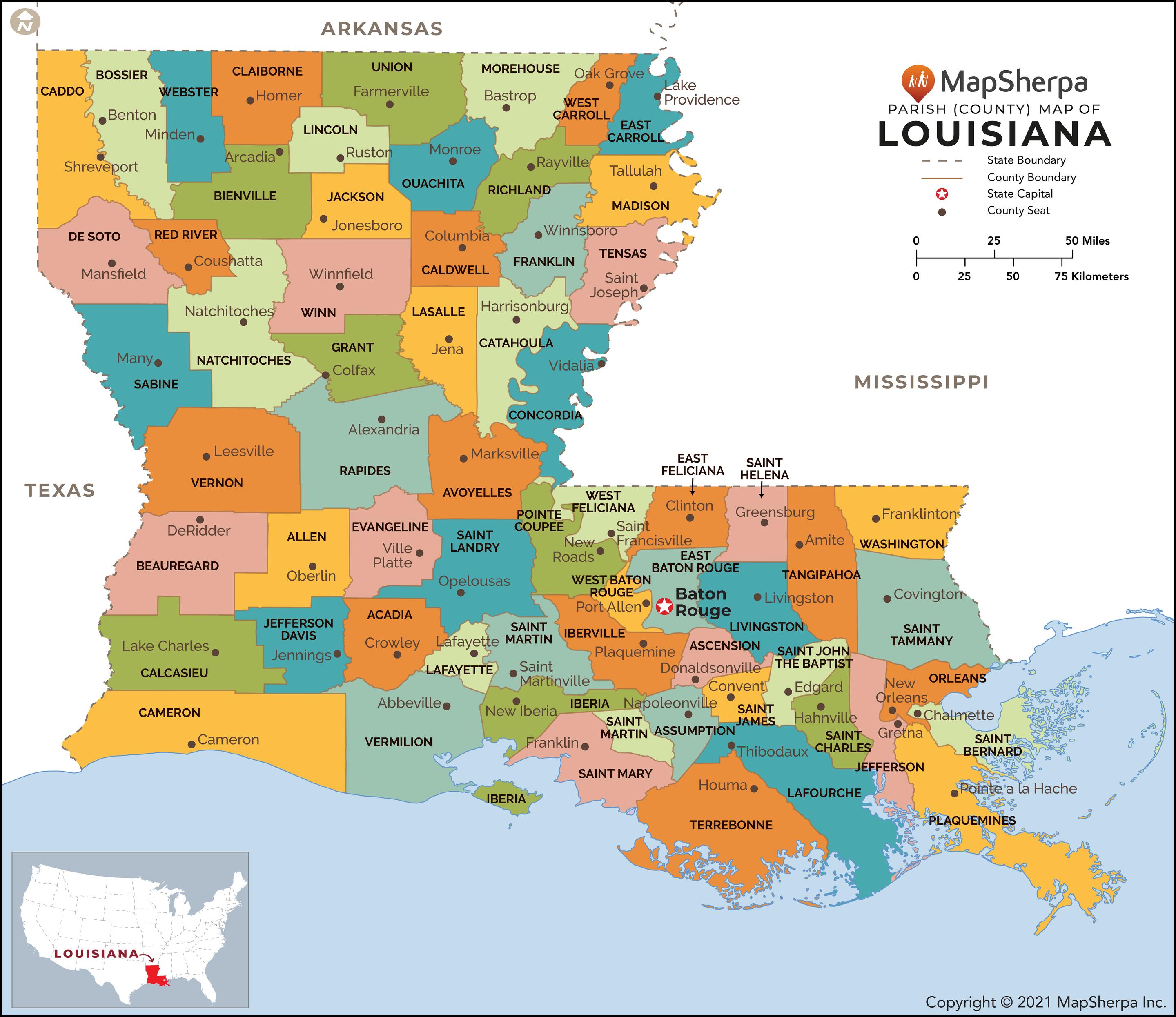 This map has been created exclusively for MapSherpa, and designed for reference or business use. Clear and clean colors & fonts matched with cartographic research makes this map of Louisiana Parishes (Counties) Map easily readable and useful. The map shows the 64 parishes of Louisiana and their borders across the Pelican State.