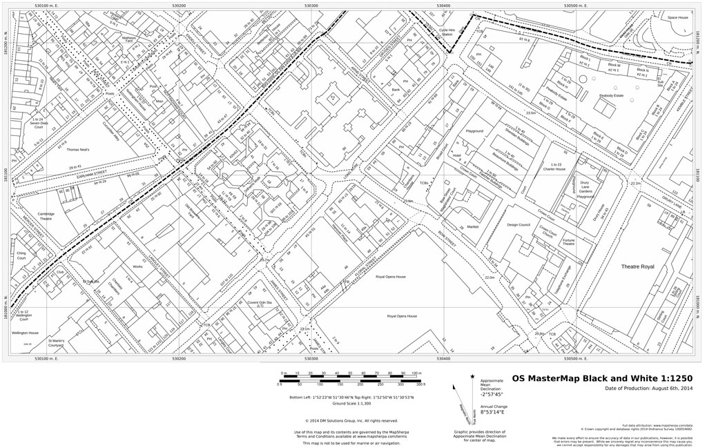 The most detailed and comprehensive map data-set of Great Britain from the Ordnance Survey. Mapping data is updated quarterly so maps are always current. Maps are suitable for Planning applications and Land Registry purposes. Maps can be created in black and white at a flexible scale between 1:420 and 1:1,250.