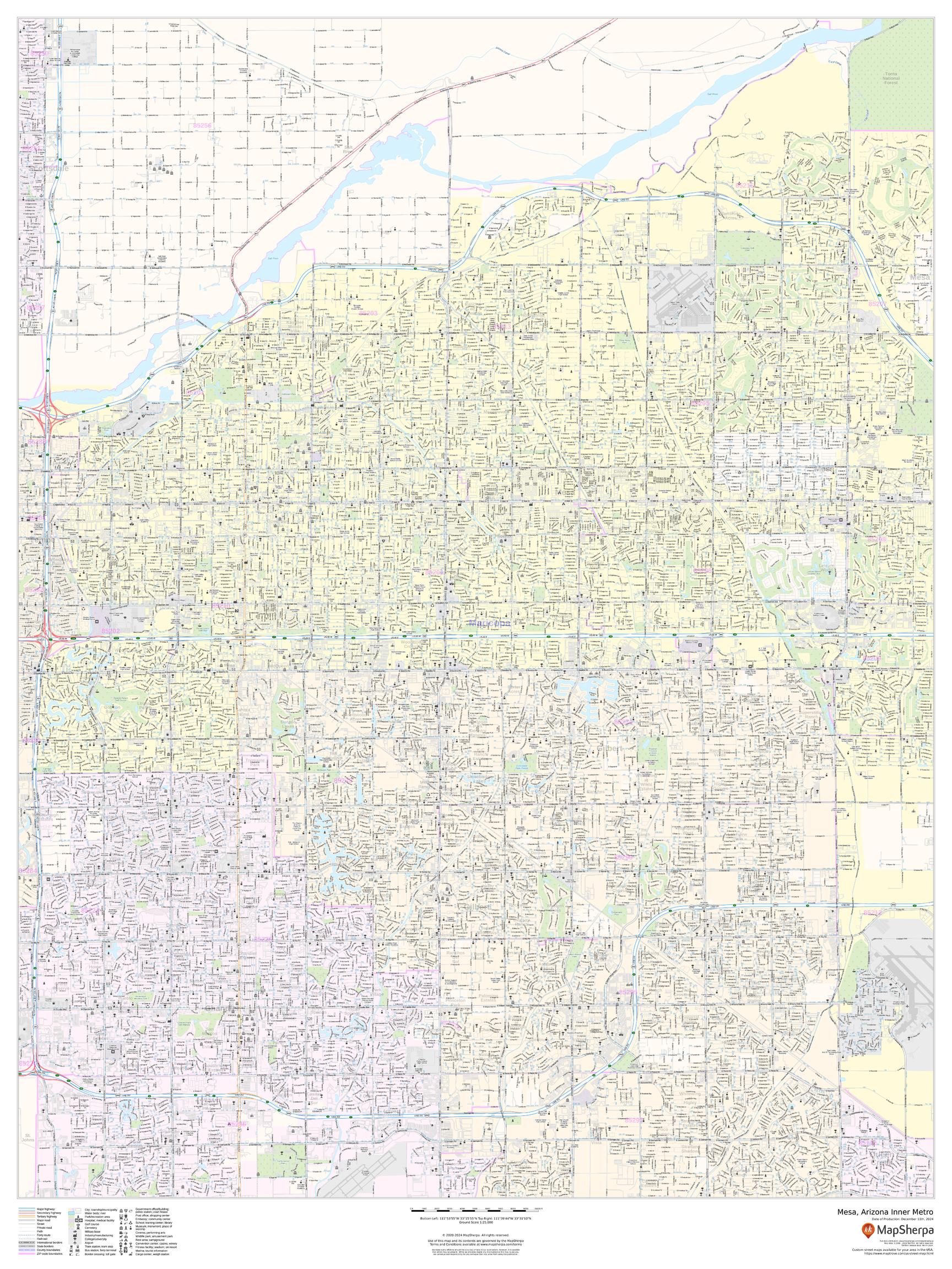 This portrait-oriented map of central Mesa, Arizona shows detailed street level information including extensive street labeling. Ideal for planning of deliveries, home services, sales territories, real estate and much more. Base map features include all roads with major roads and highways labelled; neighborhood names; railways; high level land use such as parks and recreation areas, industrial areas and hospital campuses; and a variety of points of interest including schools, libraries, stadiums, museums, border crossings and more.