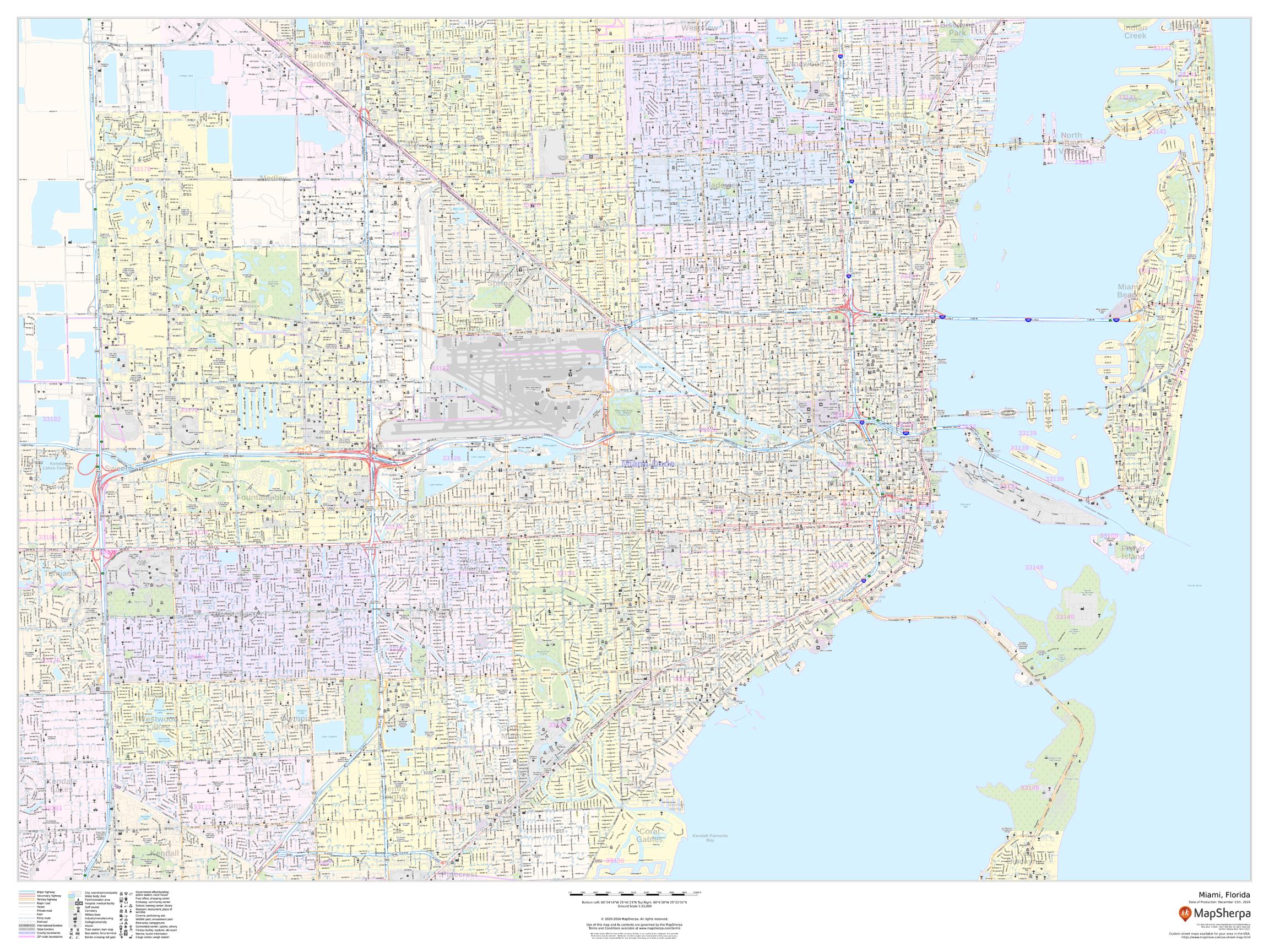 This landscape-oriented map of Miami, Florida shows detailed street level information including extensive street labeling. Ideal for planning of deliveries, home services, sales territories, real estate and much more. Base map features include all roads with major roads and highways labelled; neighborhood names; railways; high level land use such as parks and recreation areas, industrial areas and hospital campuses; and a variety of points of interest including schools, libraries, stadiums, museums, border crossings and more.