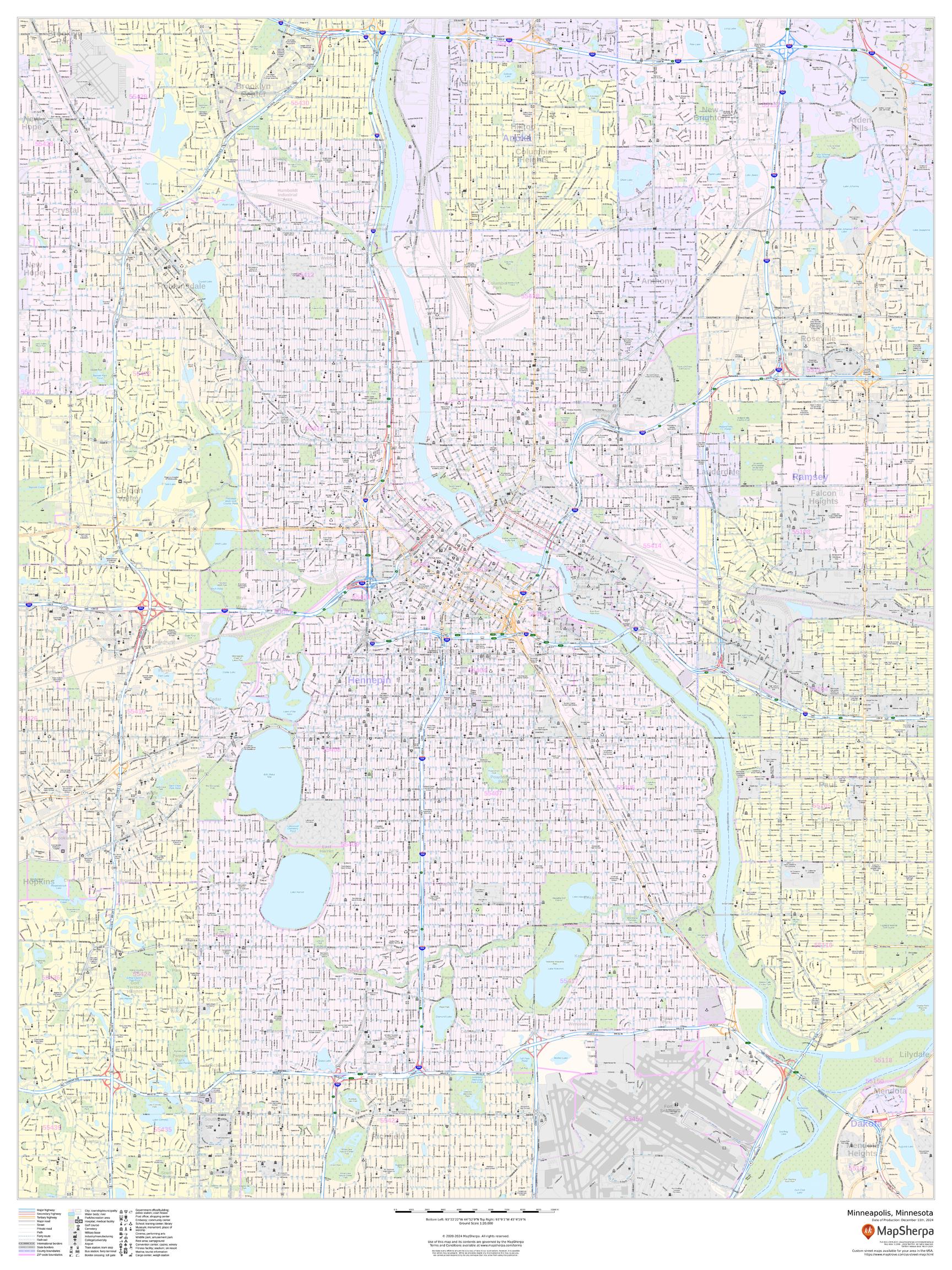 This portrait-oriented map of Minneapolis, Minnesota shows detailed street level information including extensive street labeling. Ideal for planning of deliveries, home services, sales territories, real estate and much more. Base map features include all roads with major roads and highways labelled; neighborhood names; railways; high level land use such as parks and recreation areas, industrial areas and hospital campuses; and a variety of points of interest including schools, libraries, stadiums, museums, border crossings and more.
