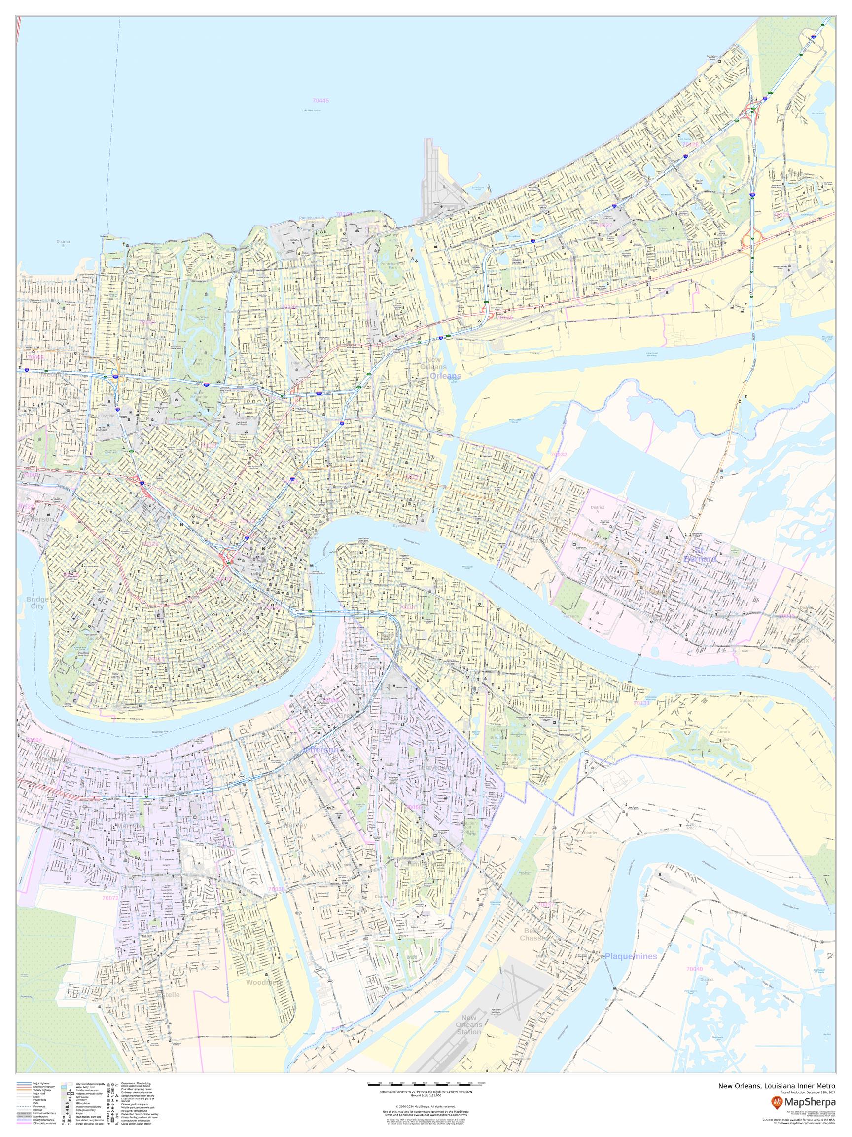 This portrait-oriented map of central New Orleans, Louisiana shows detailed street level information including extensive street labeling. Ideal for planning of deliveries, home services, sales territories, real estate and much more. Base map features include all roads with major roads and highways labelled; neighborhood names; railways; high level land use such as parks and recreation areas, industrial areas and hospital campuses; and a variety of points of interest including schools, libraries, stadiums, museums, border crossings and more.