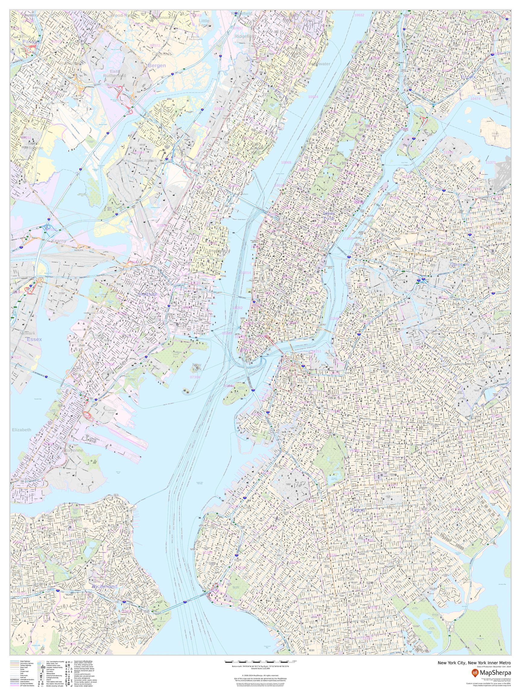 This portrait-oriented map of central New York City, New York shows detailed street level information including extensive street labeling. Ideal for planning of deliveries, home services, sales territories, real estate and much more. Base map features include all roads with major roads and highways labelled; neighborhood names; railways; high level land use such as parks and recreation areas, industrial areas and hospital campuses; and a variety of points of interest including schools, libraries, stadiums, museums, border crossings and more.