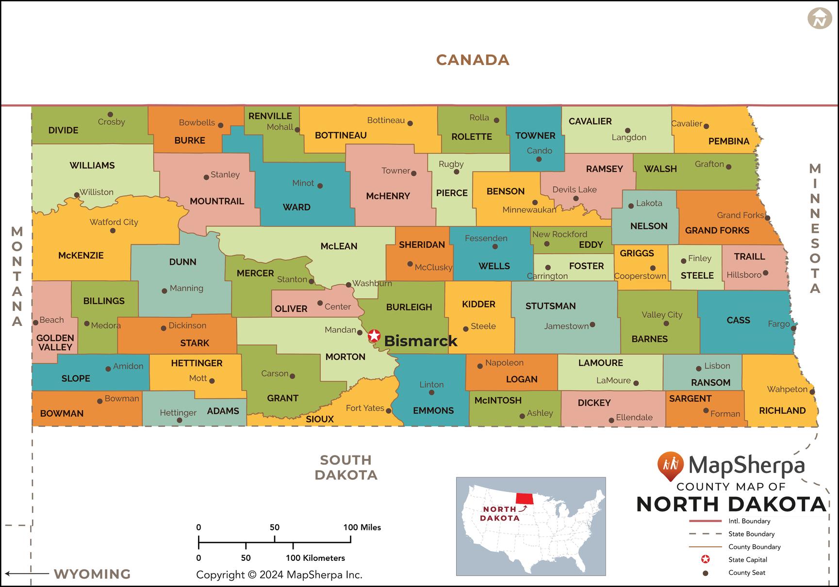 This map has been created exclusively for MapSherpa, and designed for reference or business use. Clear and clean colors & fonts matched with cartographic research makes this map of the 53 North Dakota counties easily readable and useful.