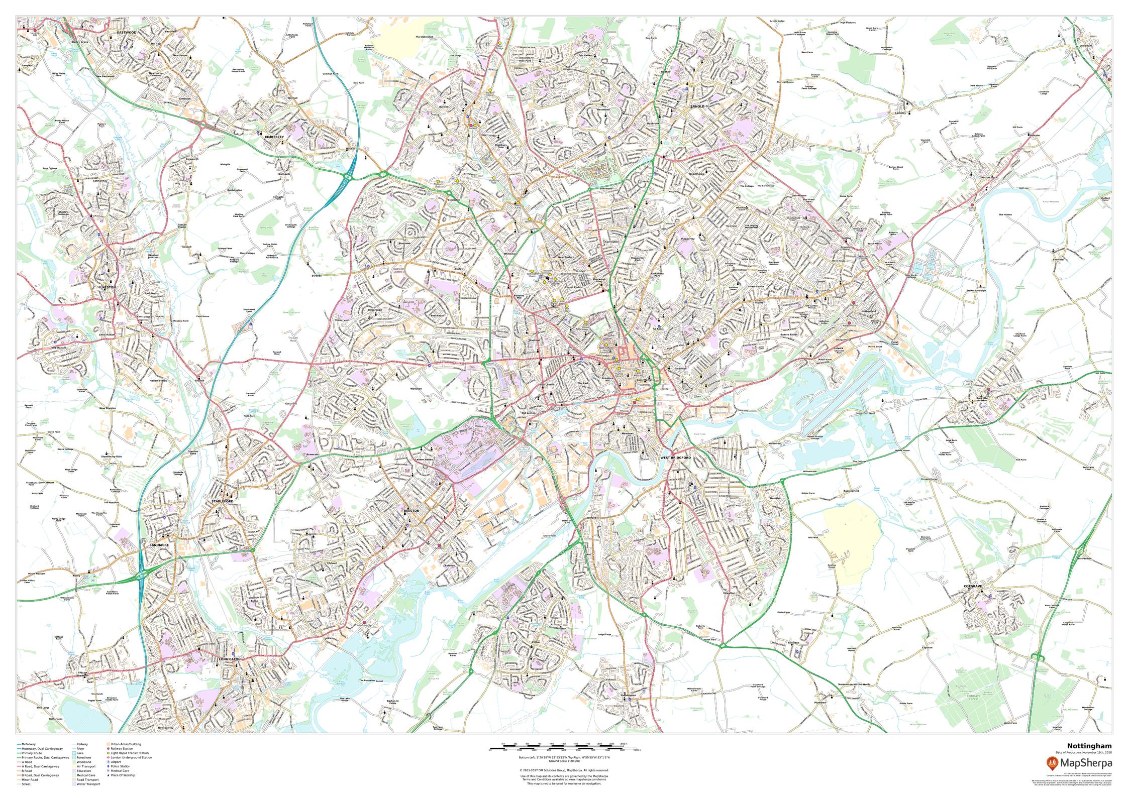 This map of Nottingham shows detailed street level information including extensive street labelling. Ideal for planning of deliveries, home services, sales territories, real estate and much more.