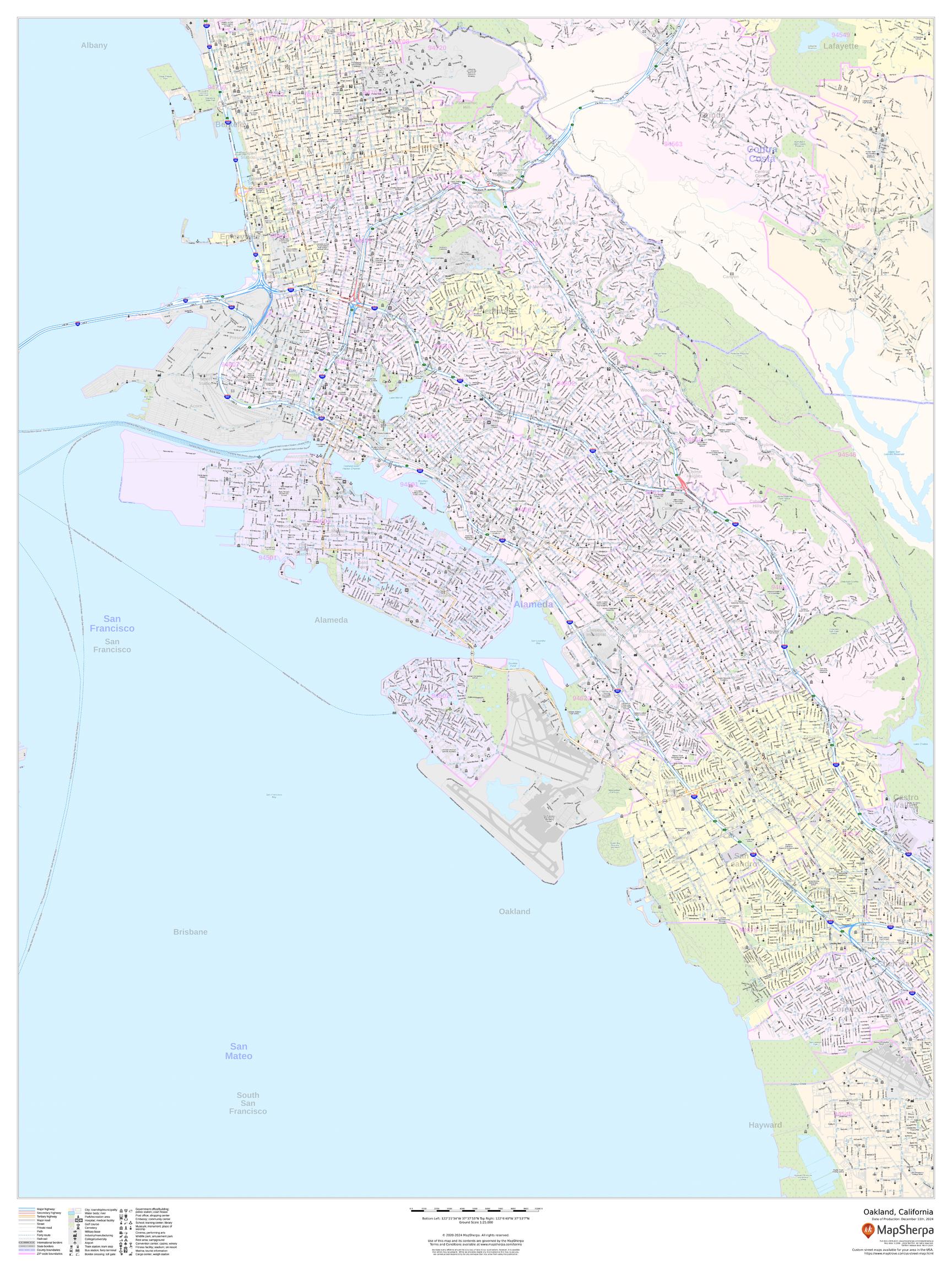 This portrait-oriented map of Oakland, California shows detailed street level information including extensive street labeling. Ideal for planning of deliveries, home services, sales territories, real estate and much more. Base map features include all roads with major roads and highways labelled; neighborhood names; railways; high level land use such as parks and recreation areas, industrial areas and hospital campuses; and a variety of points of interest including schools, libraries, stadiums, museums, border crossings and more.