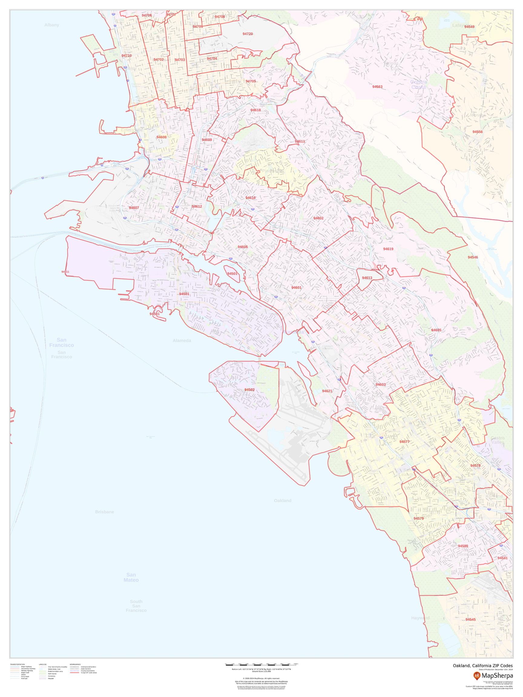 This map of Oakland, California shows ZIP code areas overlaid on a road map. Ideal for planning of deliveries, home services, sales territories, real estate and much more. Base map features include all roads with major roads and highways labelled; neighborhood names; railways; and high level land use such as parks and recreation areas, industrial areas and hospital campuses.