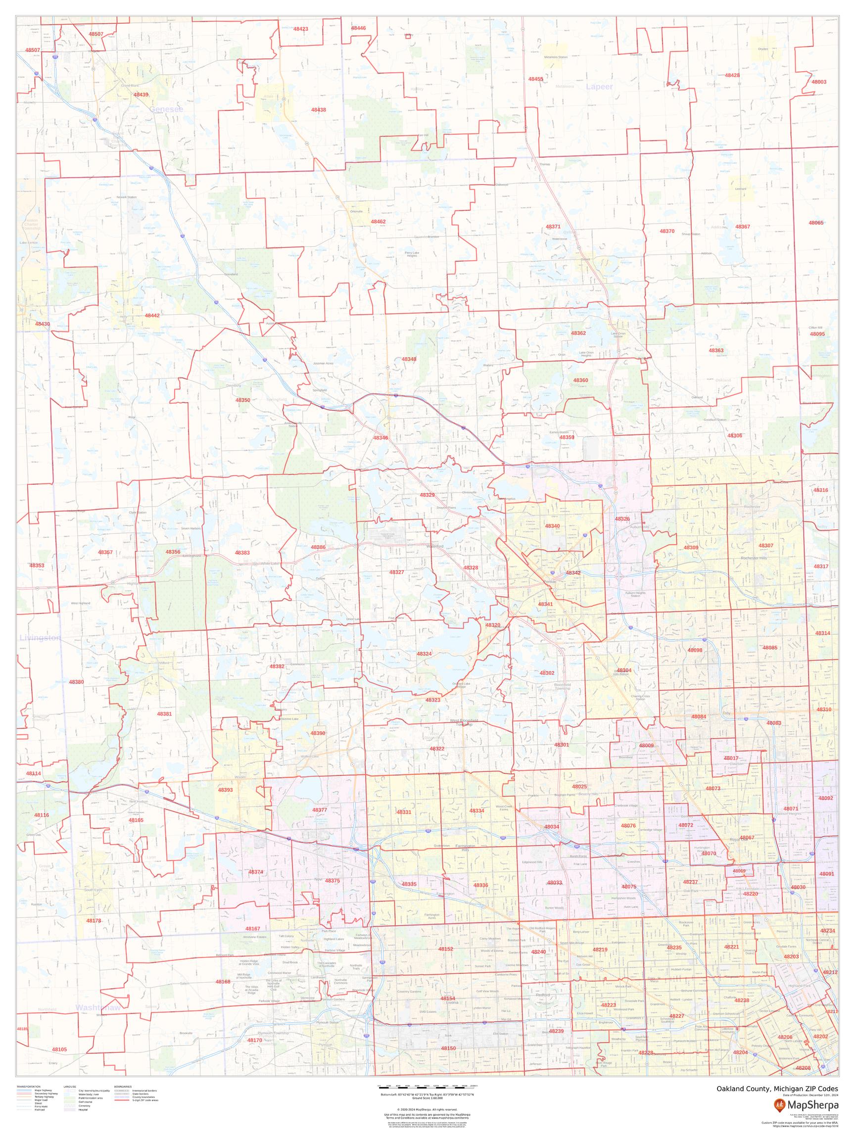 This map of Oakland County, Michigan shows ZIP code areas overlaid on a road map. Ideal for planning of deliveries, home services, sales territories, real estate and much more. Base map features include all roads with major roads and highways labelled; neighborhood names; railways; and high level land use such as parks and recreation areas, industrial areas and hospital campuses.