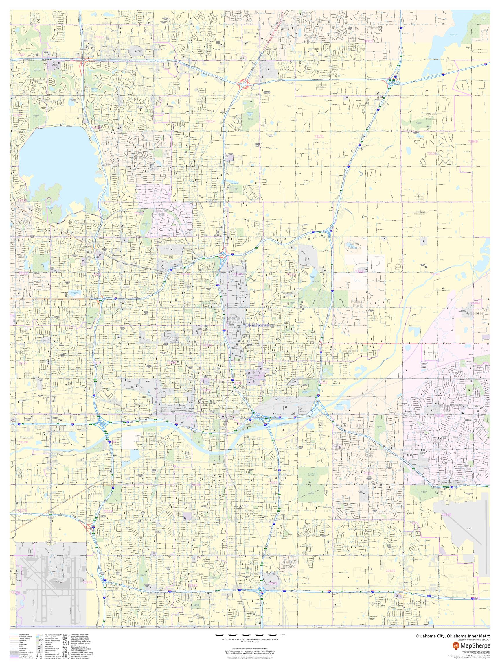 This portrait-oriented map of central Oklahoma City, Oklahoma shows detailed street level information including extensive street labeling. Ideal for planning of deliveries, home services, sales territories, real estate and much more. Base map features include all roads with major roads and highways labelled; neighborhood names; railways; high level land use such as parks and recreation areas, industrial areas and hospital campuses; and a variety of points of interest including schools, libraries, stadiums, museums, border crossings and more.