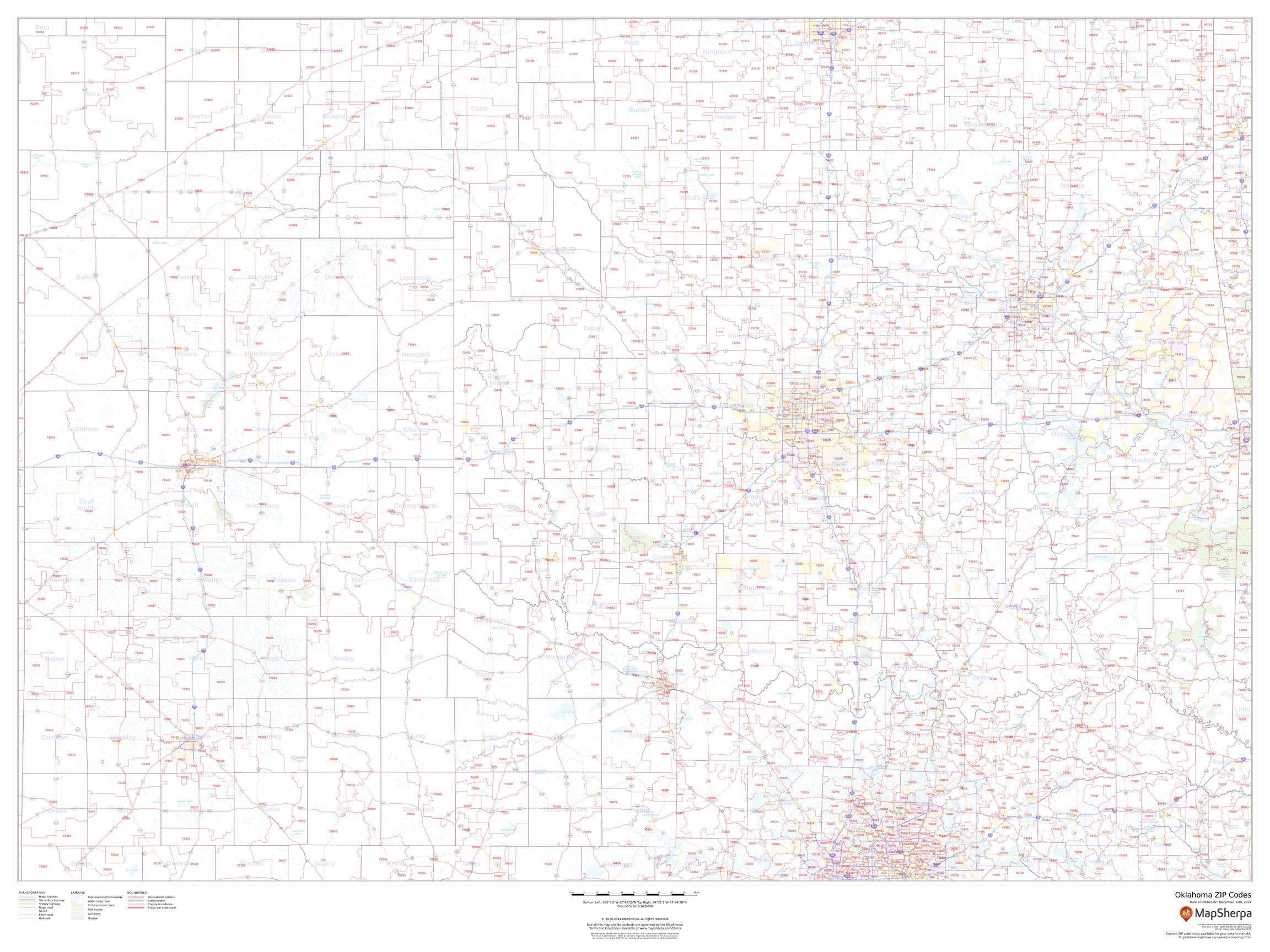 This map of Oklahoma shows ZIP codes overlaid on a road map. Base map features include county boundaries, major road network features, and state and national parks and conservation areas.