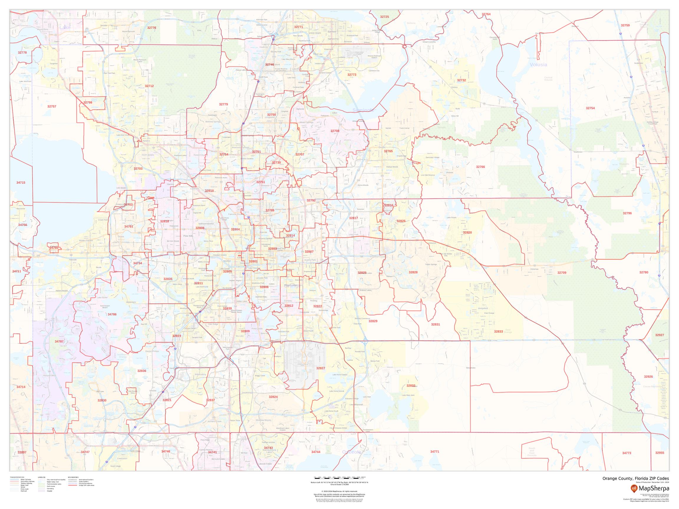 This map of Orange County, Florida shows ZIP code areas overlaid on a road map. Ideal for planning of deliveries, home services, sales territories, real estate and much more. Base map features include all roads with major roads and highways labelled; neighborhood names; railways; and high level land use such as parks and recreation areas, industrial areas and hospital campuses.