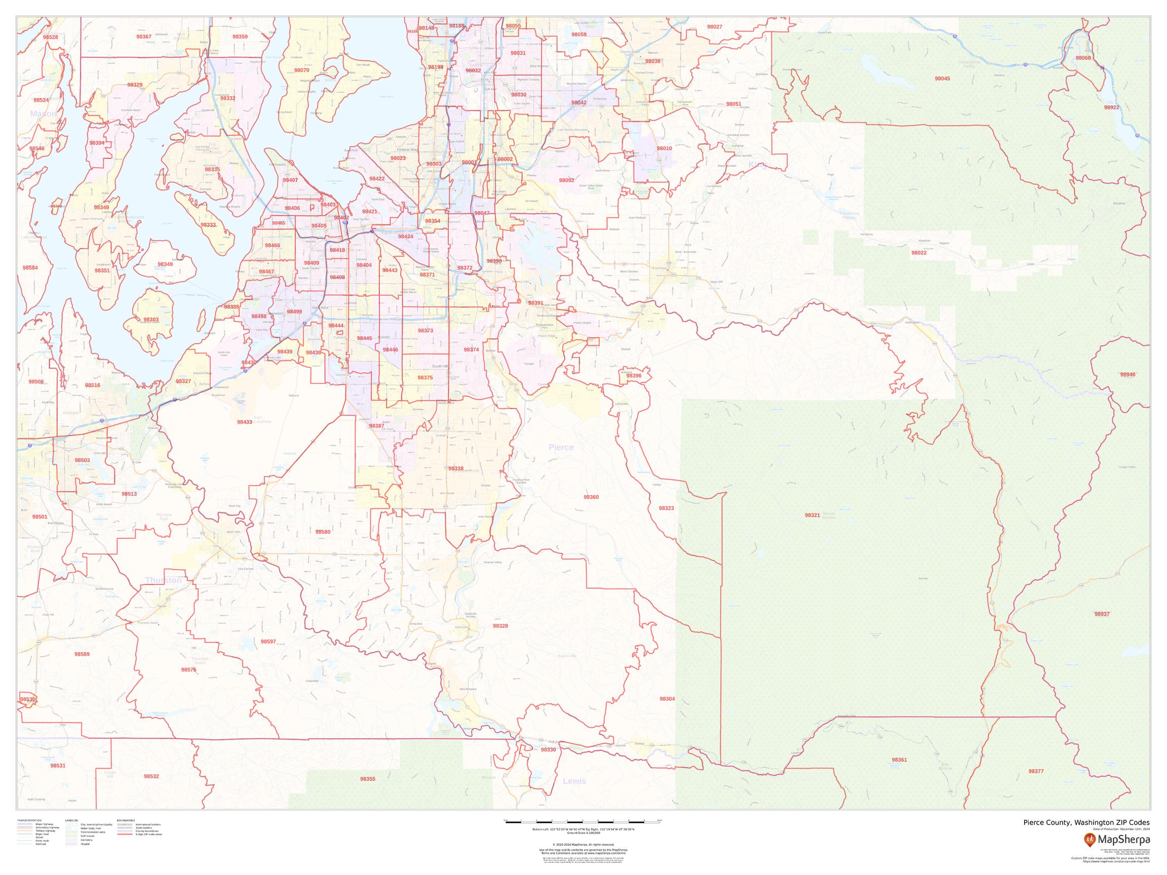 This map of Pierce County, Washington shows ZIP code areas overlaid on a road map. Ideal for planning of deliveries, home ervices, sales territories, real estate and much more. Base map features include all roads with major roads and highways labelled; neighborhood names; railways; and high level land use such as parks and recreation areas, industrial areas and hospital campuses.