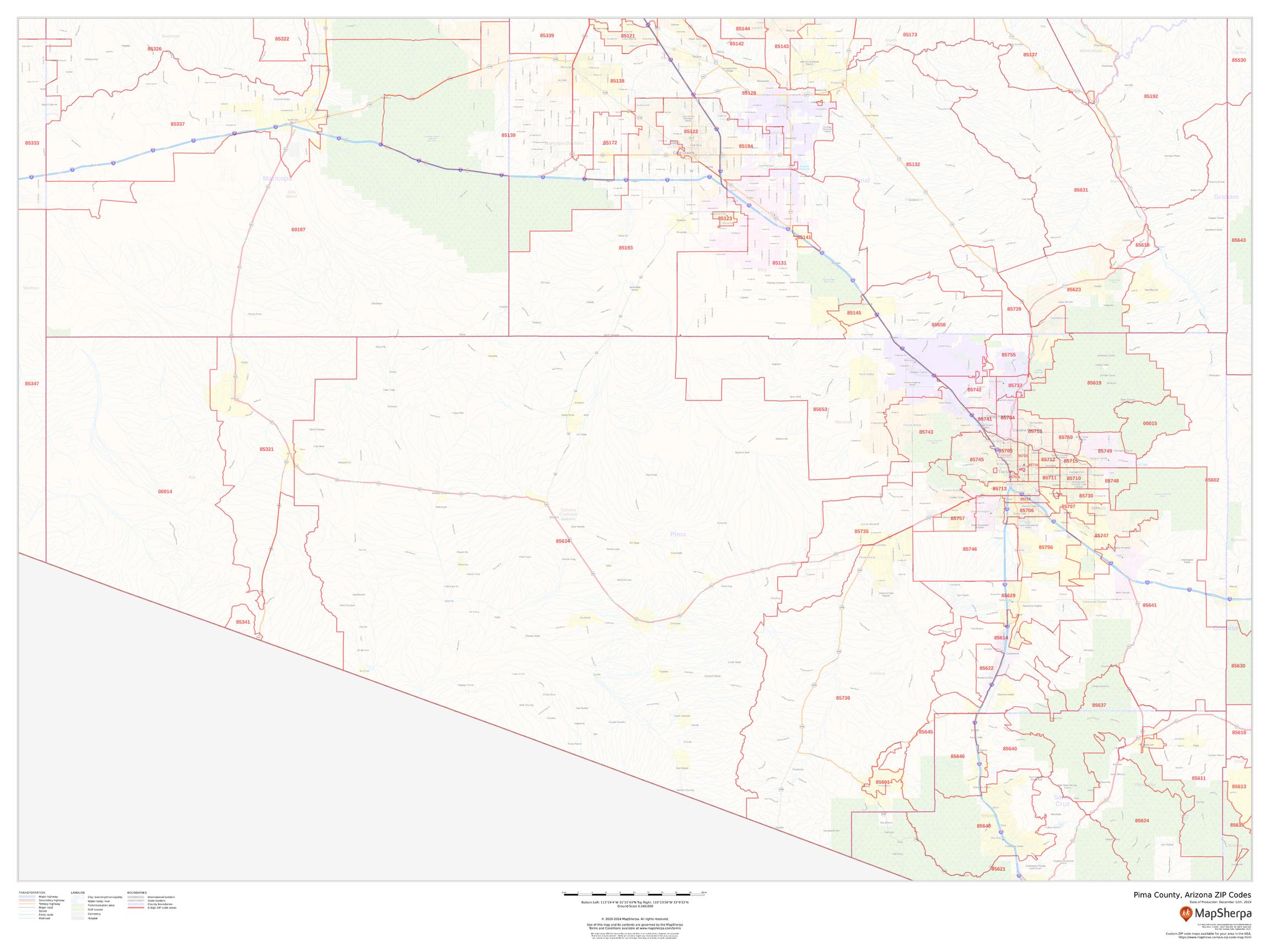 This map of Pima County, Arizona shows ZIP code areas overlaid on a road map. Ideal for planning of deliveries, home services, sales territories, real estate and much more. Base map features include all roads with major roads and highways labelled; neighborhood names; railways; and high level land use such as parks and recreation areas, industrial areas and hospital campuses.