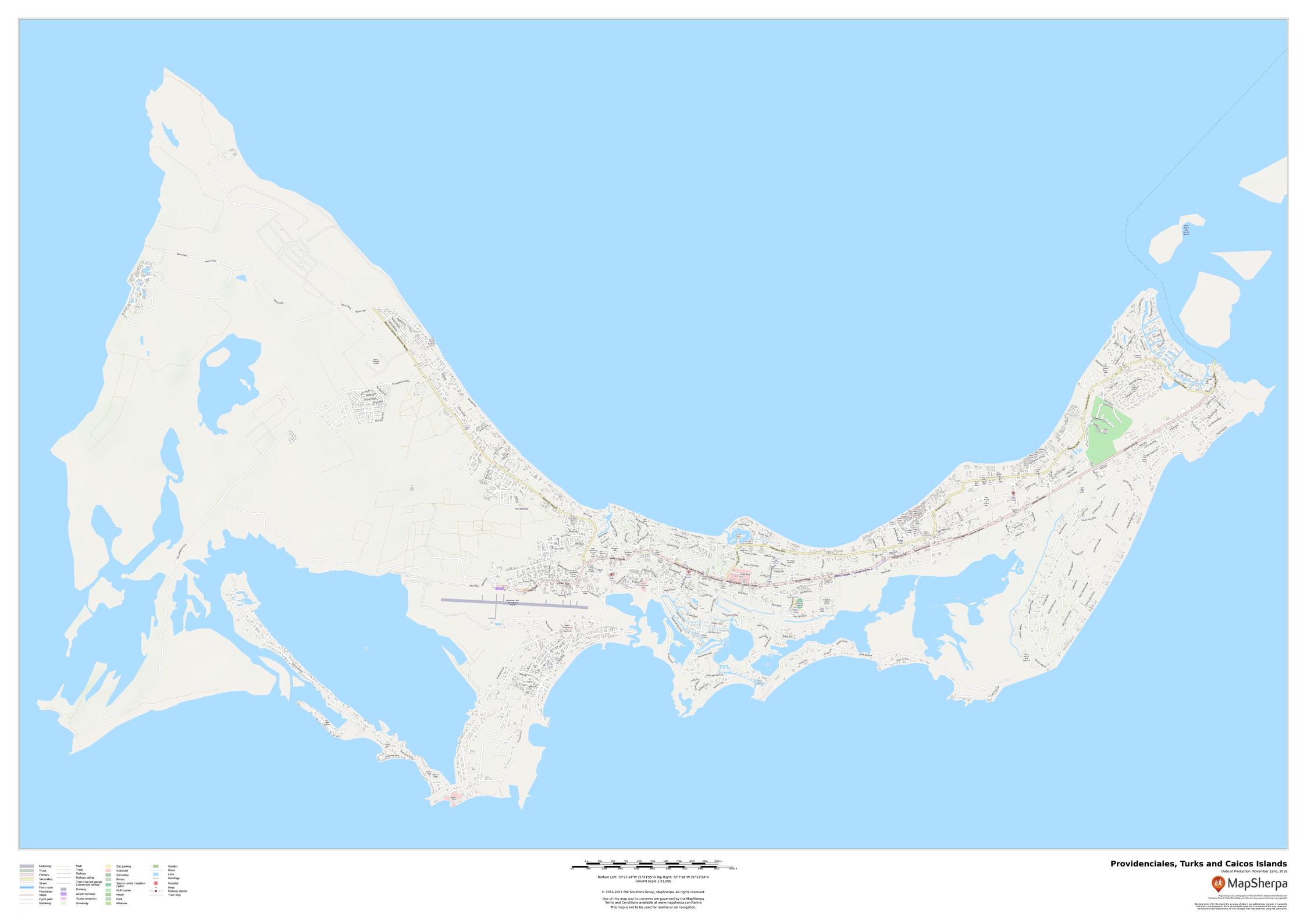 This map of Providenciales, Turks and Caicos Islands features a clean design and rich detail designed for the traveller.