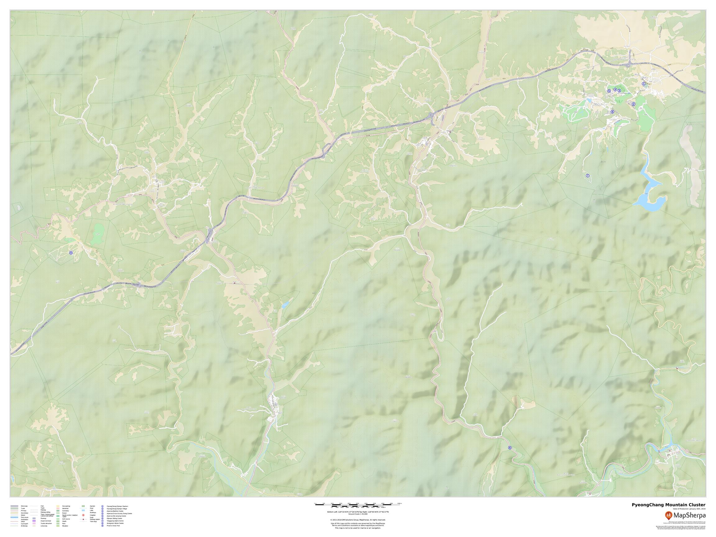 This road map highlights the 9 venues of the 2018 PyeongChang winter games that are in the PyeongChang Mountain Cluster: PyeongChang Olympic Stadium, Alpensia Biathalon Centre, Alpensia Cross-Country Skiing Centre, Alpensia Ski Jumping Centre, Olympic Sliding Centre, Phoenix Snow Park, Jeongseon Alpine Centre, Yongpyong Alpine Centre, and the PyeongChang Olympic Village.