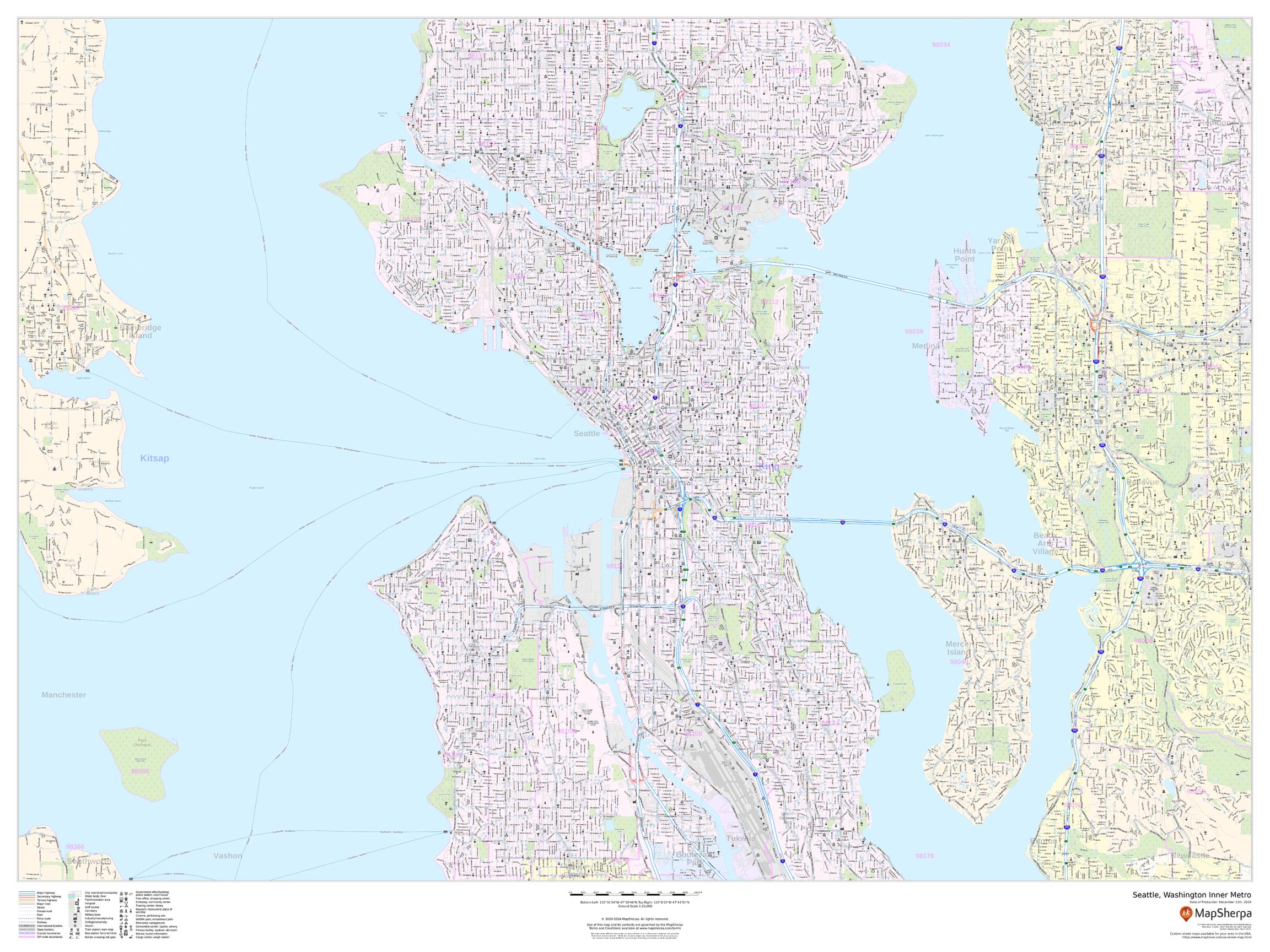 This landscape-oriented map of central Seattle, Washington shows detailed street level information including extensive street labeling. Ideal for planning of deliveries, home services, sales territories, real estate and much more. Base map features include all roads with major roads and highways labelled; neighborhood names; railways; high level land use such as parks and recreation areas, industrial areas and hospital campuses; and a variety of points of interest including schools, libraries, stadiums, museums, border crossings and more.