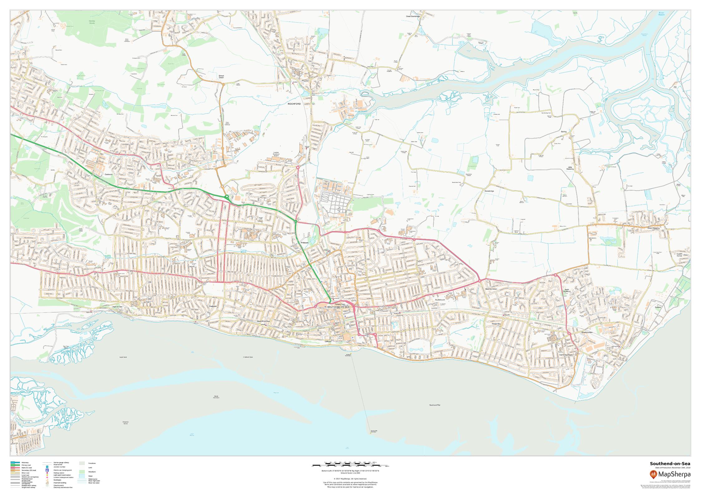 This map of Southend-on-Sea shows detailed street level information including extensive street labelling. Ideal for planning of deliveries, home services, sales territories, real estate and much more.
