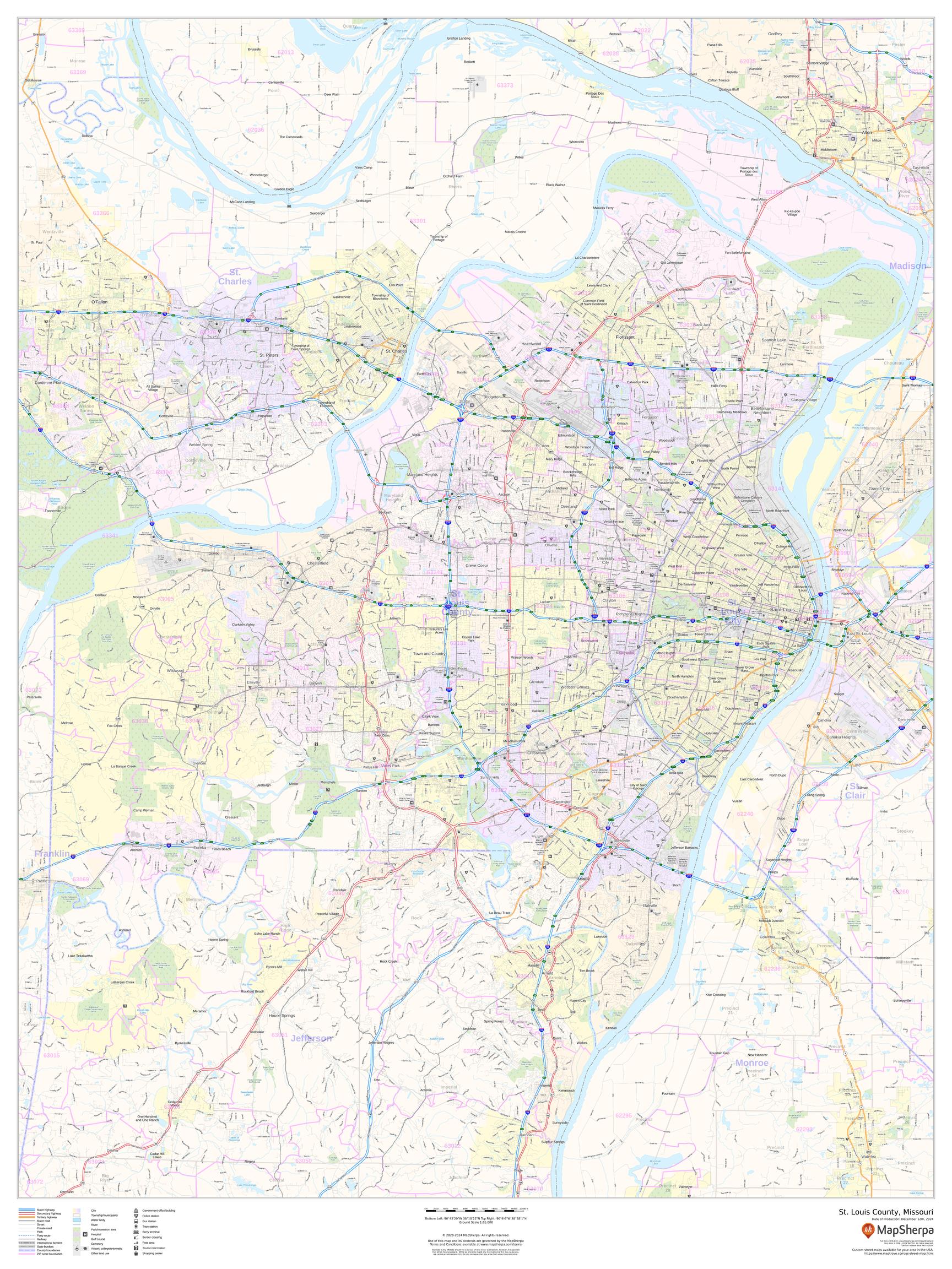 This map of St. Louis County, Missouri shows regional level information. Base map features include highways and major roads with labelling; neighborhood names; railways; high level land use such as parks and recreation areas, industrial areas and hospital campuses; and a selection of points of interest including transportation hubs like airports and train stations, tourist information, police stations and shopping centres. ZIP code boundaries are shown as a secondary map feature.