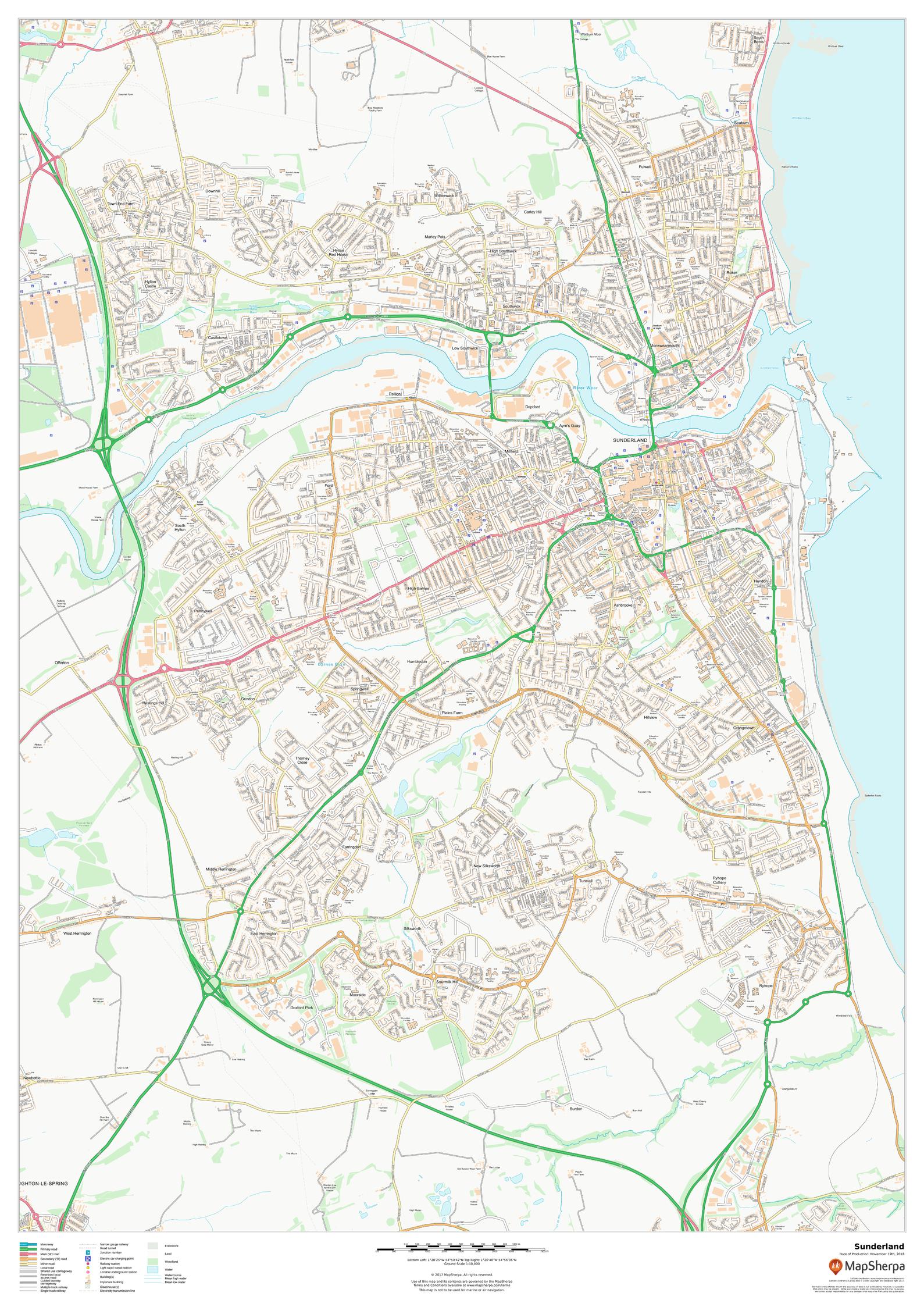 This map of Sunderland shows detailed street level information including extensive street labelling. Ideal for planning of deliveries, home services, sales territories, real estate and much more.