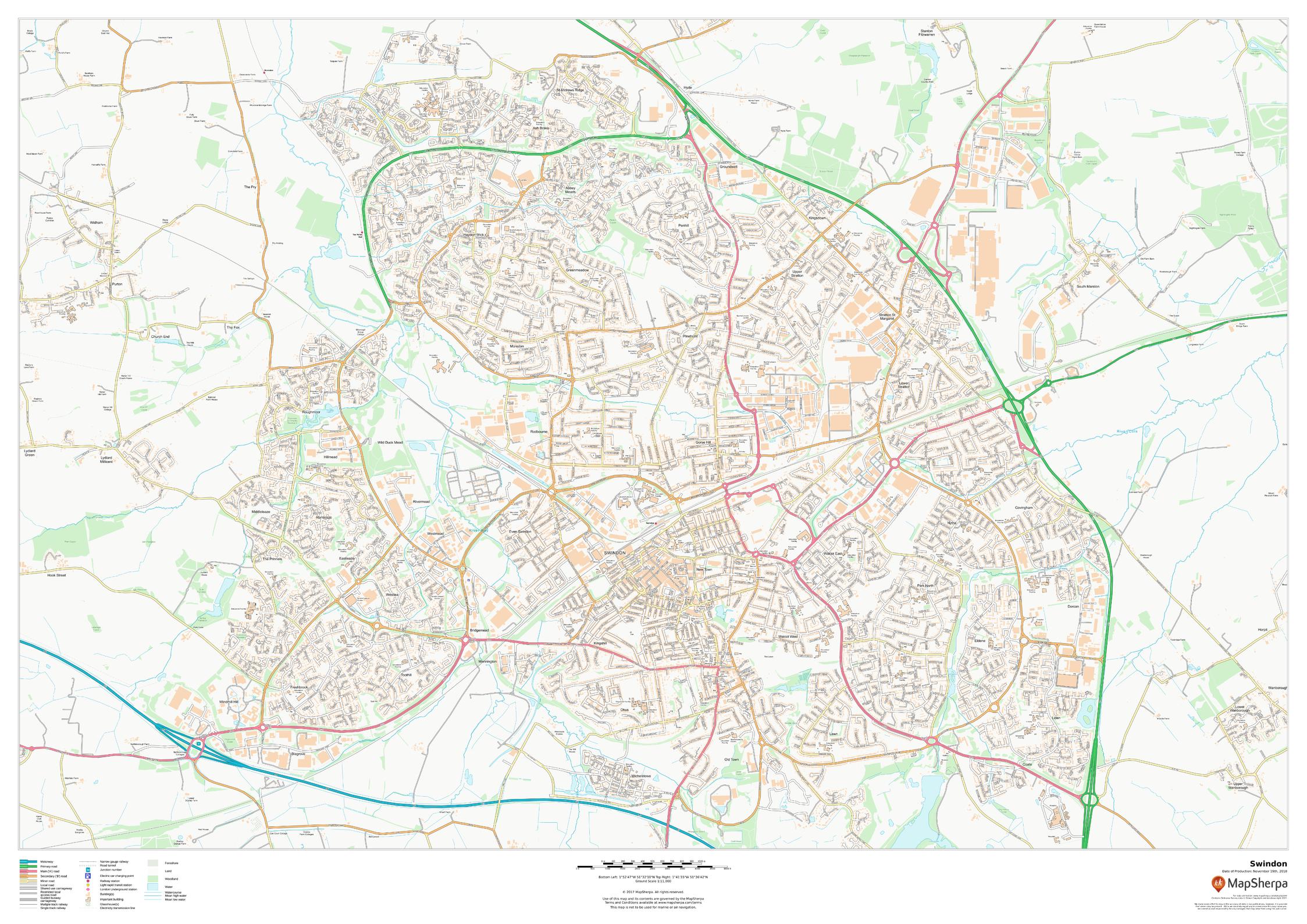 This map of Swindon shows detailed street level information including extensive street labelling. Ideal for planning of deliveries, home services, sales territories, real estate and much more.