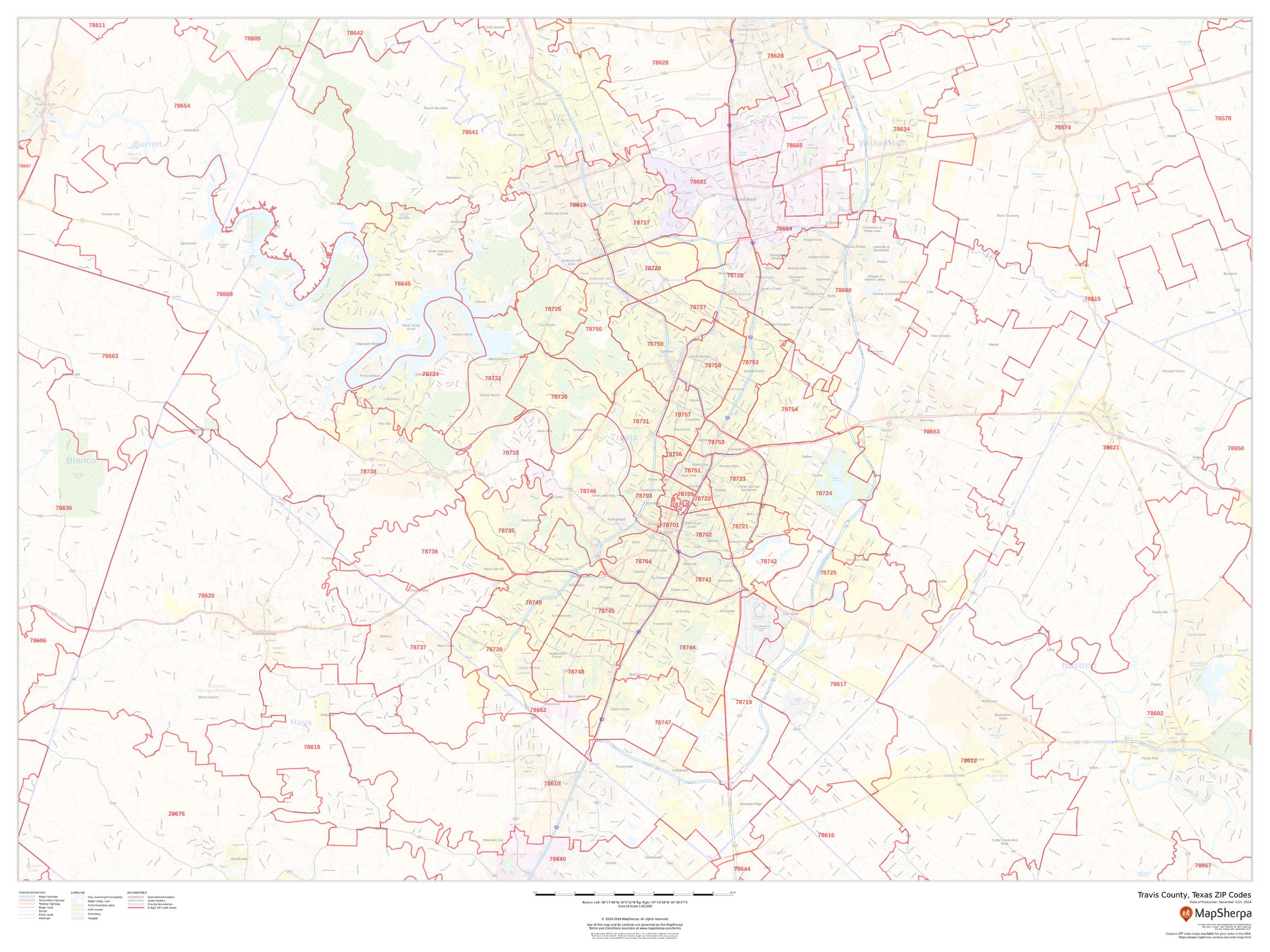 This map of Travis County, Texas shows ZIP code areas overlaid on a road map. Ideal for planning of deliveries, home services, sales territories, real estate and much more. Base map features include all roads with major roads and highways labelled; neighborhood names; railways; and high level land use such as parks and recreation areas, industrial areas and hospital campuses.