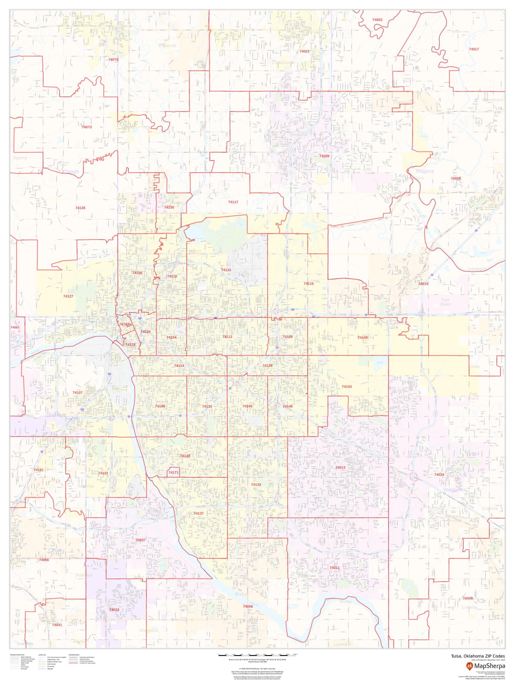 This map of Tulsa, Oklahoma shows ZIP code areas overlaid on a road map. Ideal for planning of deliveries, home services, sales territories, real estate and much more. Base map features include all roads with major roads and highways labelled; neighborhood names; railways; and high level land use such as parks and recreation areas, industrial areas and hospital campuses.