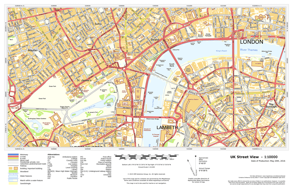 This product provides Ordnance Survey street-level mapping that has been specifically designed to cartographically emphasize road carriageways, road names and their Department for Transport numbers. Major public buildings are also highlighted and annotated. Maps can be created at a fixed scale of 1:10,000.