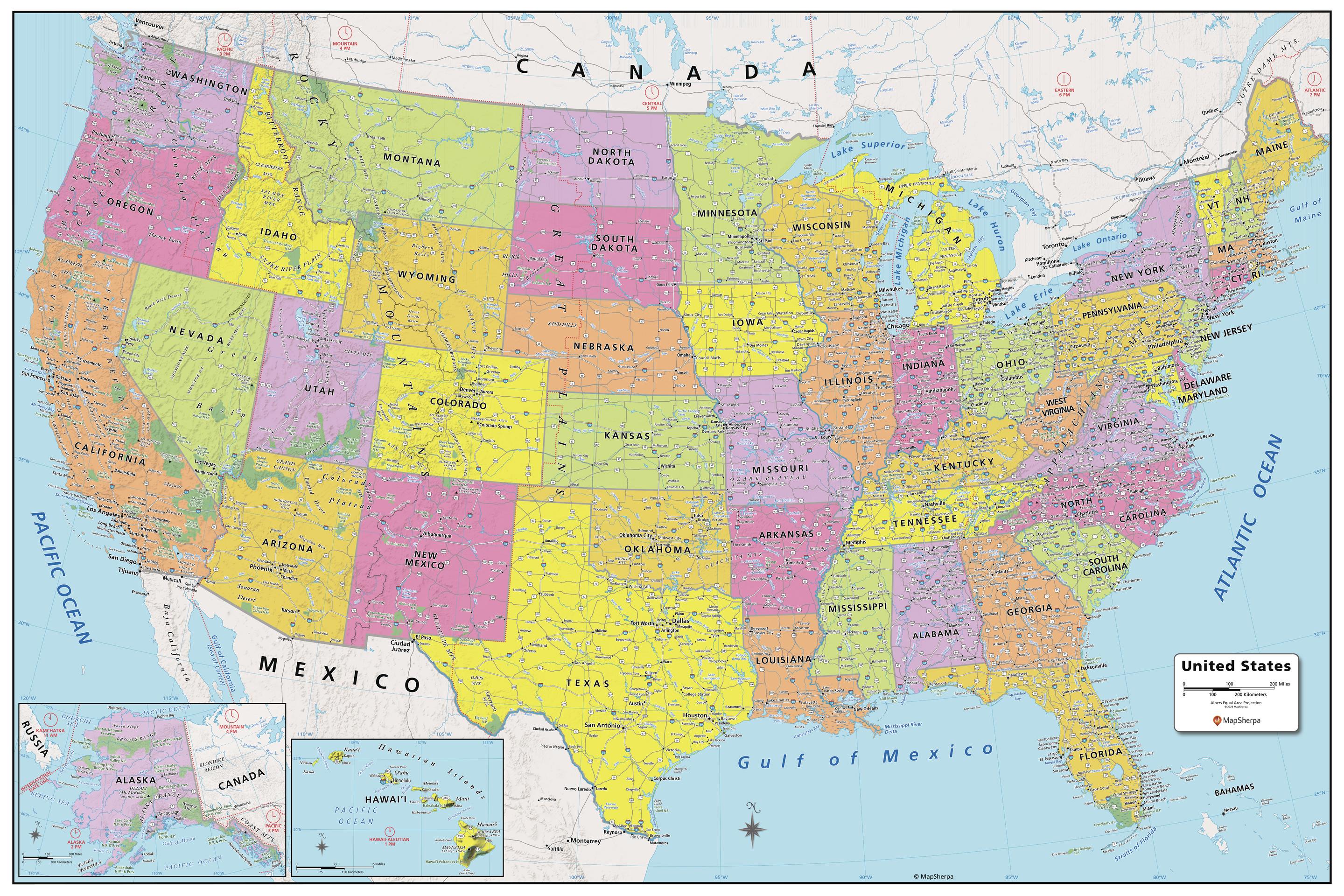 Created specifically for MapSherpa, this United States Political Map stretches from the Pacific to the Atlantic Oceans, and the Gulf of Mexico to international neighbor borders, this US Political Map displays all 50 states that make up the country. For readability, each state is easily identified by a different color, the map prominently shows; State capitals, primary cities & towns, major national parks, primary water features, mountain ranges and all time zones. With multiple sizes available, this is the perfect reference map for home, office, or school use.