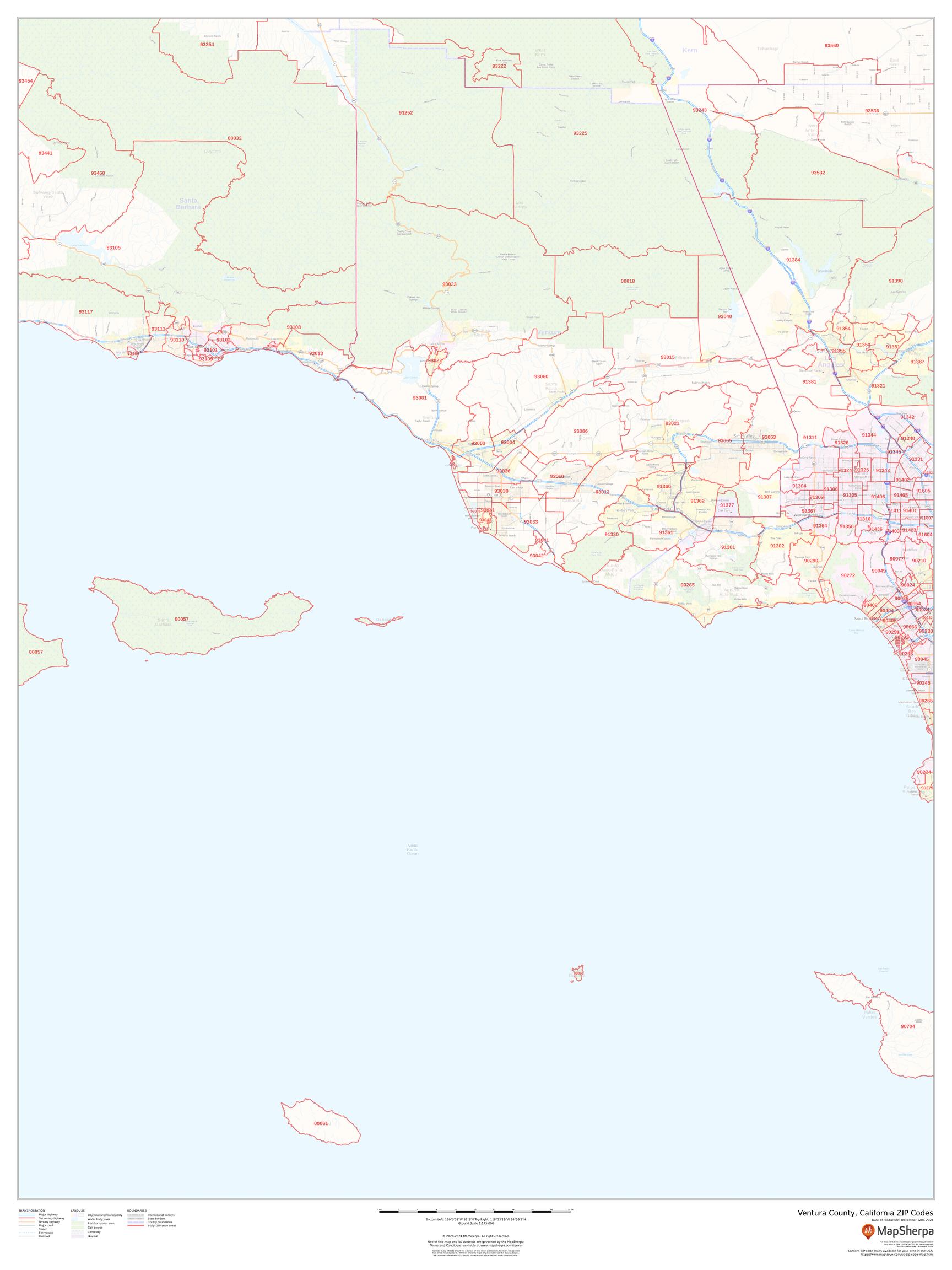 This map of Ventura County, California shows ZIP code areas overlaid on a road map. Ideal for planning of deliveries, home ervices, sales territories, real estate and much more. Base map features include all roads with major roads and highways labelled; neighborhood names; railways; and high level land use such as parks and recreation areas, industrial areas and hospital campuses.